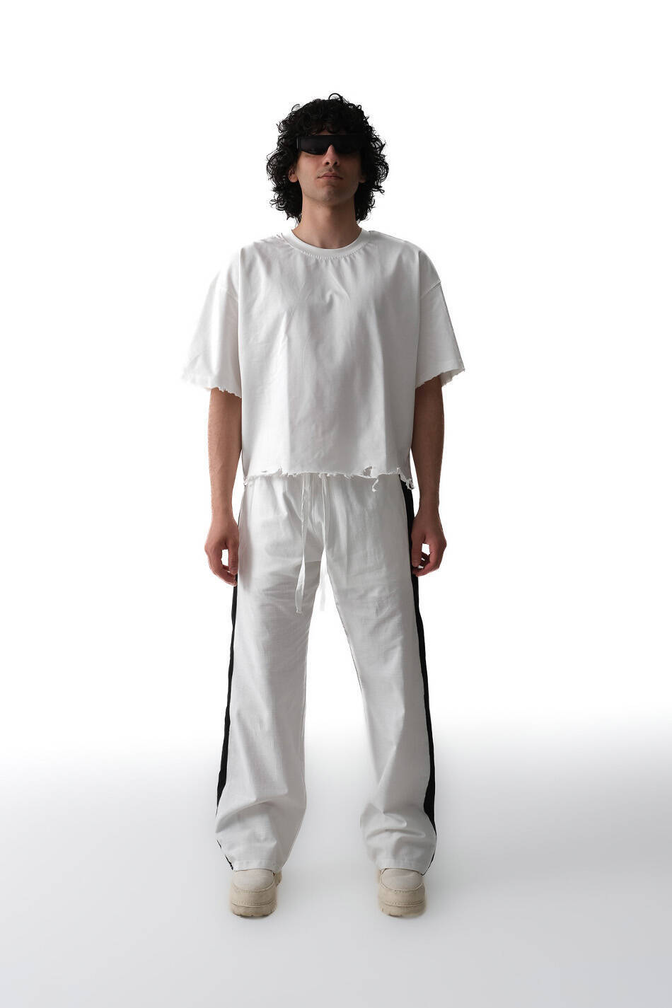 %100 Pamuk Siyah Şerit Detaylı Beyaz Pantolon