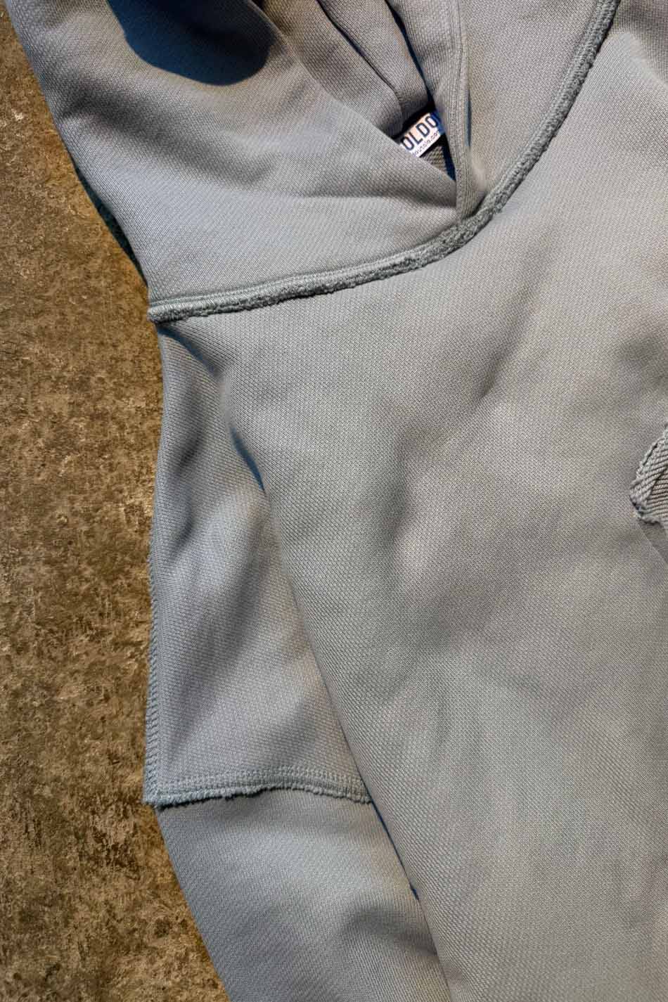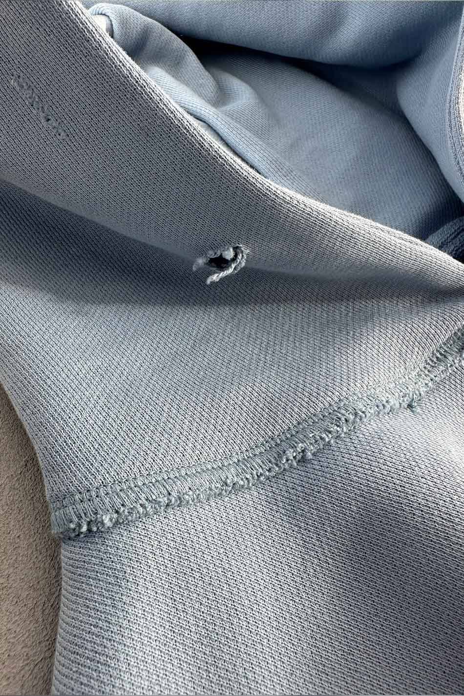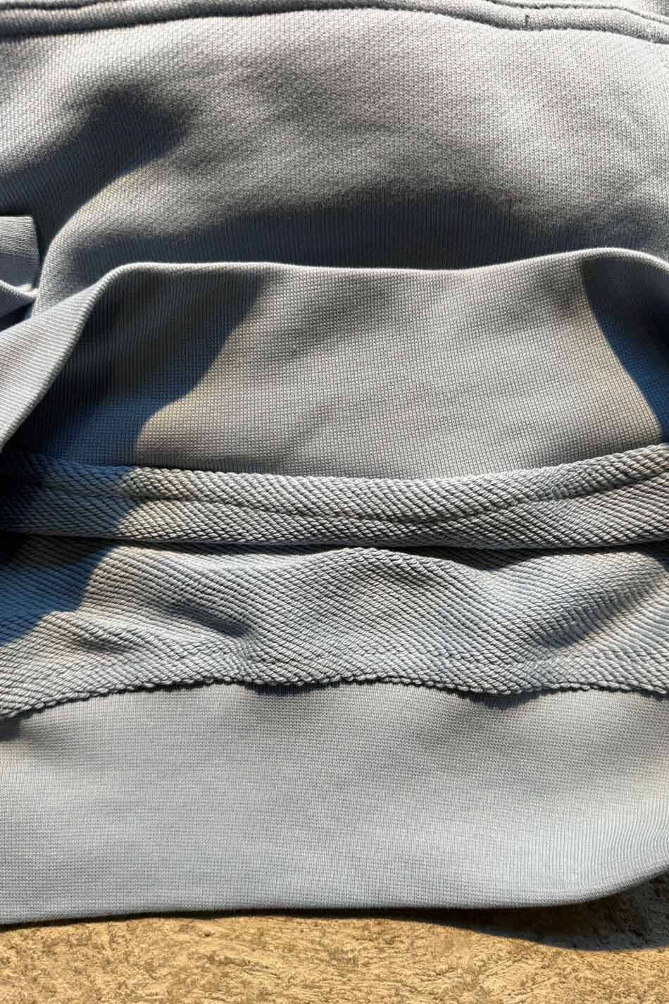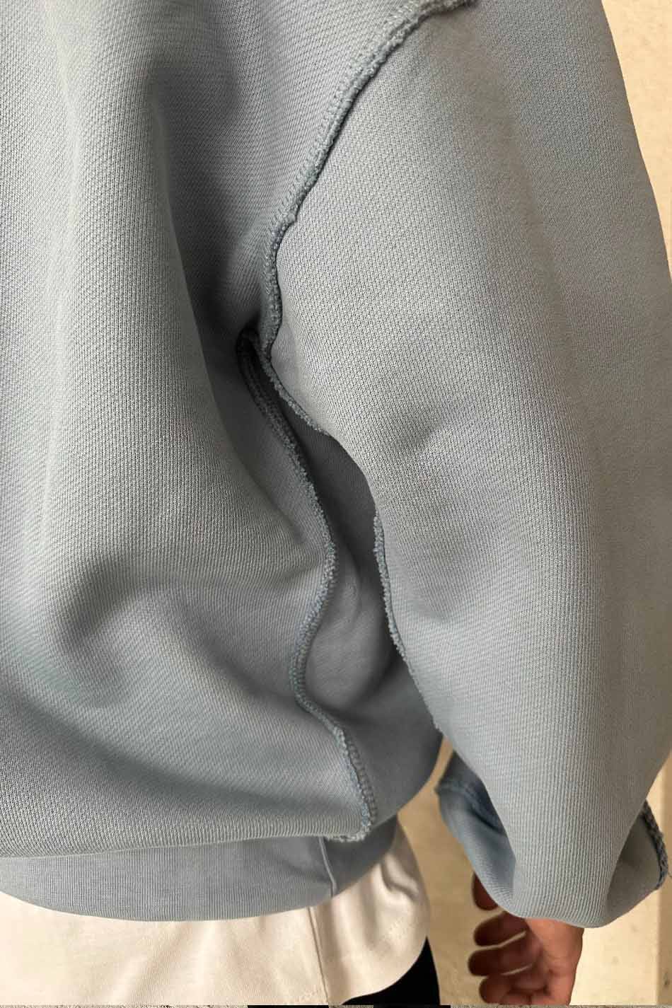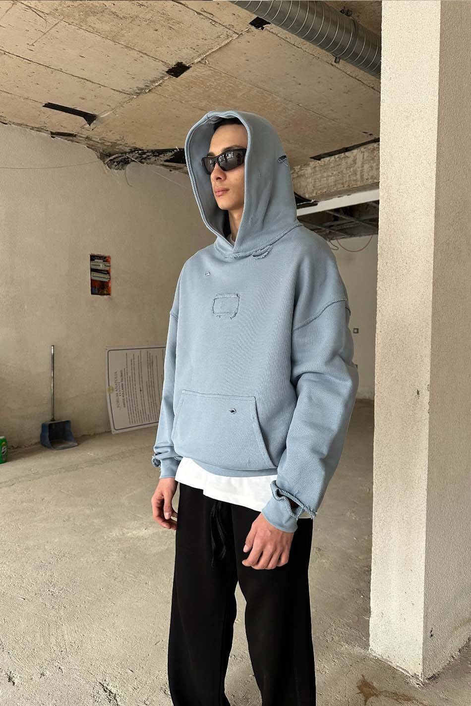 Açık Mavi Distressed Oversize Boxy Fit Hoodie. Oeko Tex sertifikalı %100 pamuklu, 450gsm ağırlığında,şardonsuz,diagonel kumaştan üretilmiştir. Kanguru cepli, göğüs kısmında dikdörtgen dikiş detaylı, düşük omuzlu. Distressed yapısıyla ve ters dikiş detaylarıyla özgün bir görünüm kazandırılmıştır.Tamamen el işçiliği ile yıpratma işlemi uygulanmıştır.