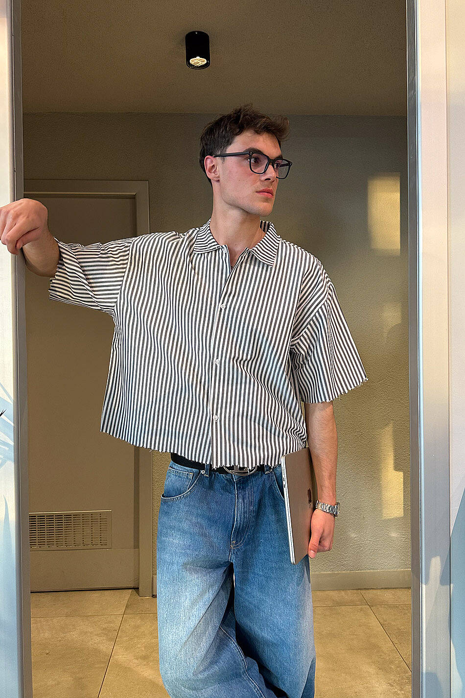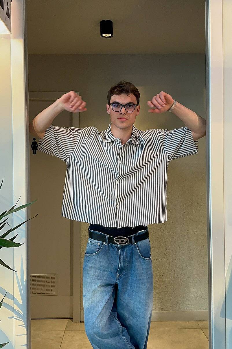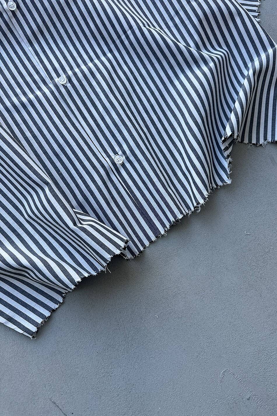 Antrasit Çizgili Distressed Yarım Kol Boxy Fit Gömlek
