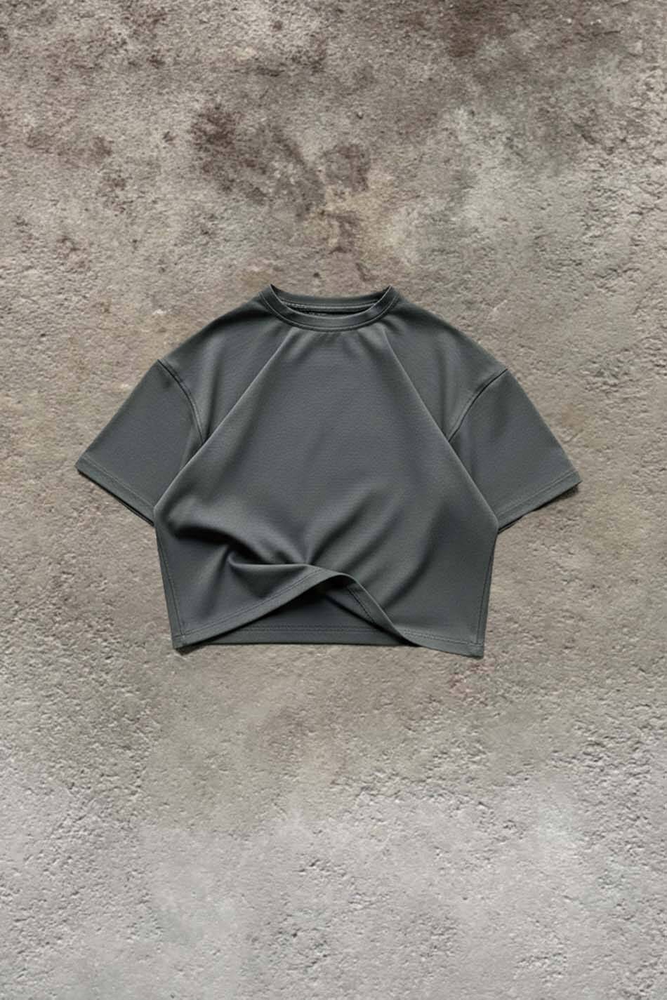 Antrasit Double Face (çift yüzlü) kumaştan üretilen bu tişört, yüksek gramajlı ve tok bir yapıya sahiptir. Boxy Fit kesimi sayesinde geniş gövde, düşük omuz ve kısa boy ölçüleri kalıbını oluşturur. Formunu koruyan kumaş ve pürüzsüz dokusuyla vücut hatlarını belli etmeyen, kalıplı bir duruş sergiler.