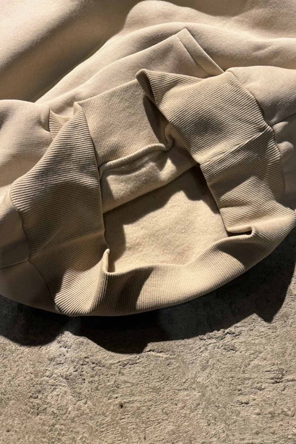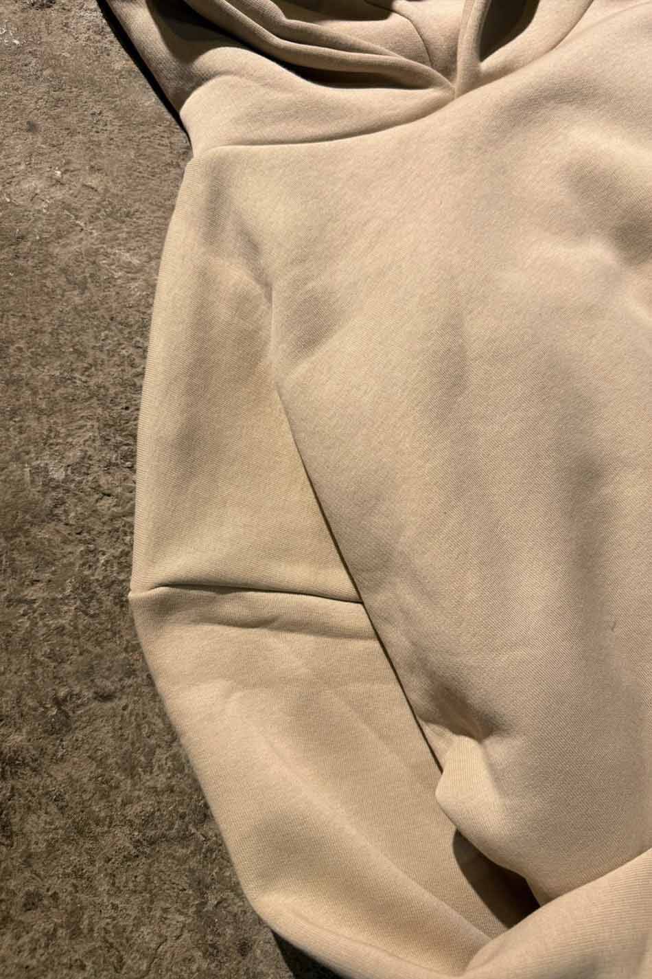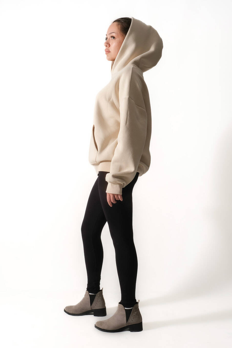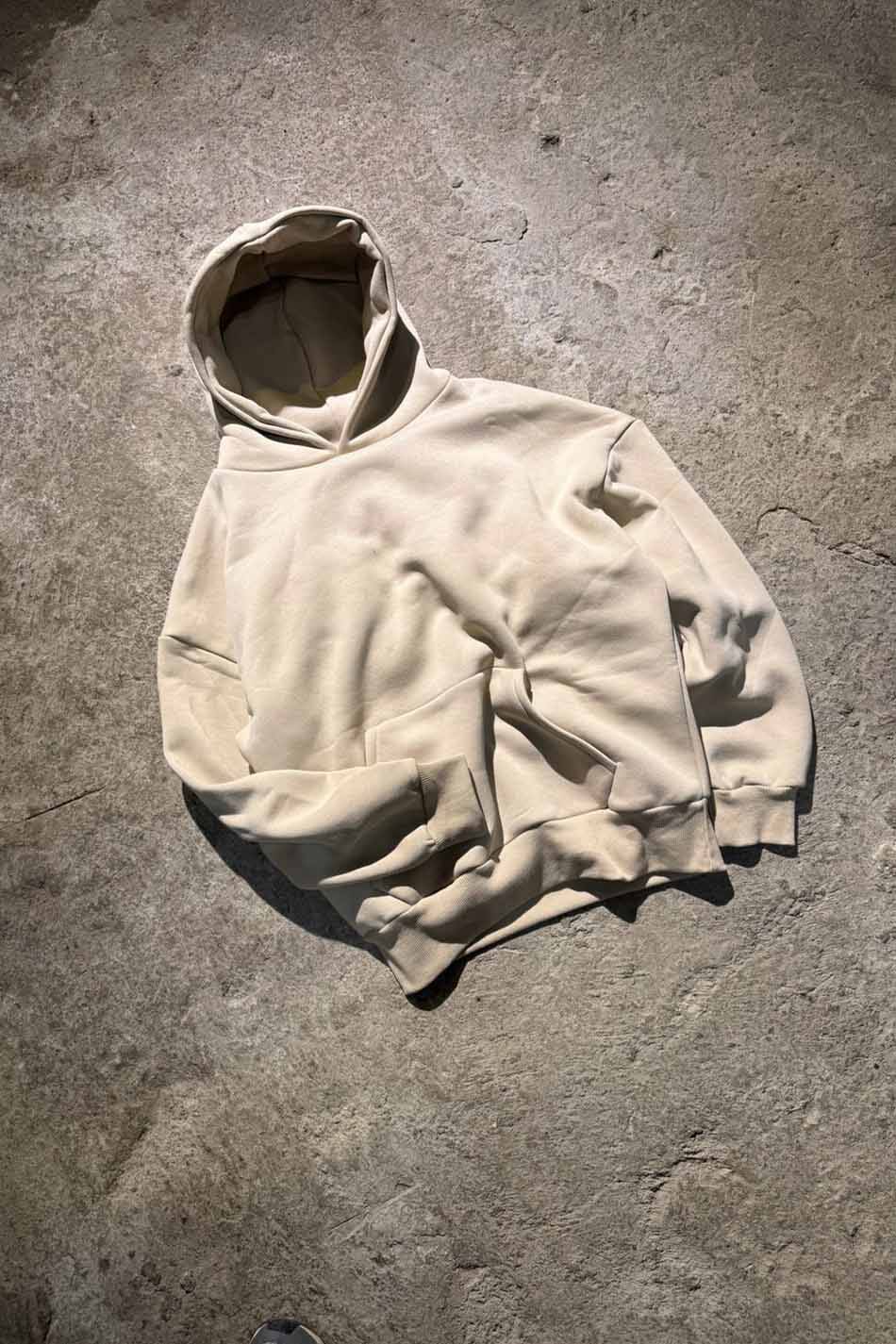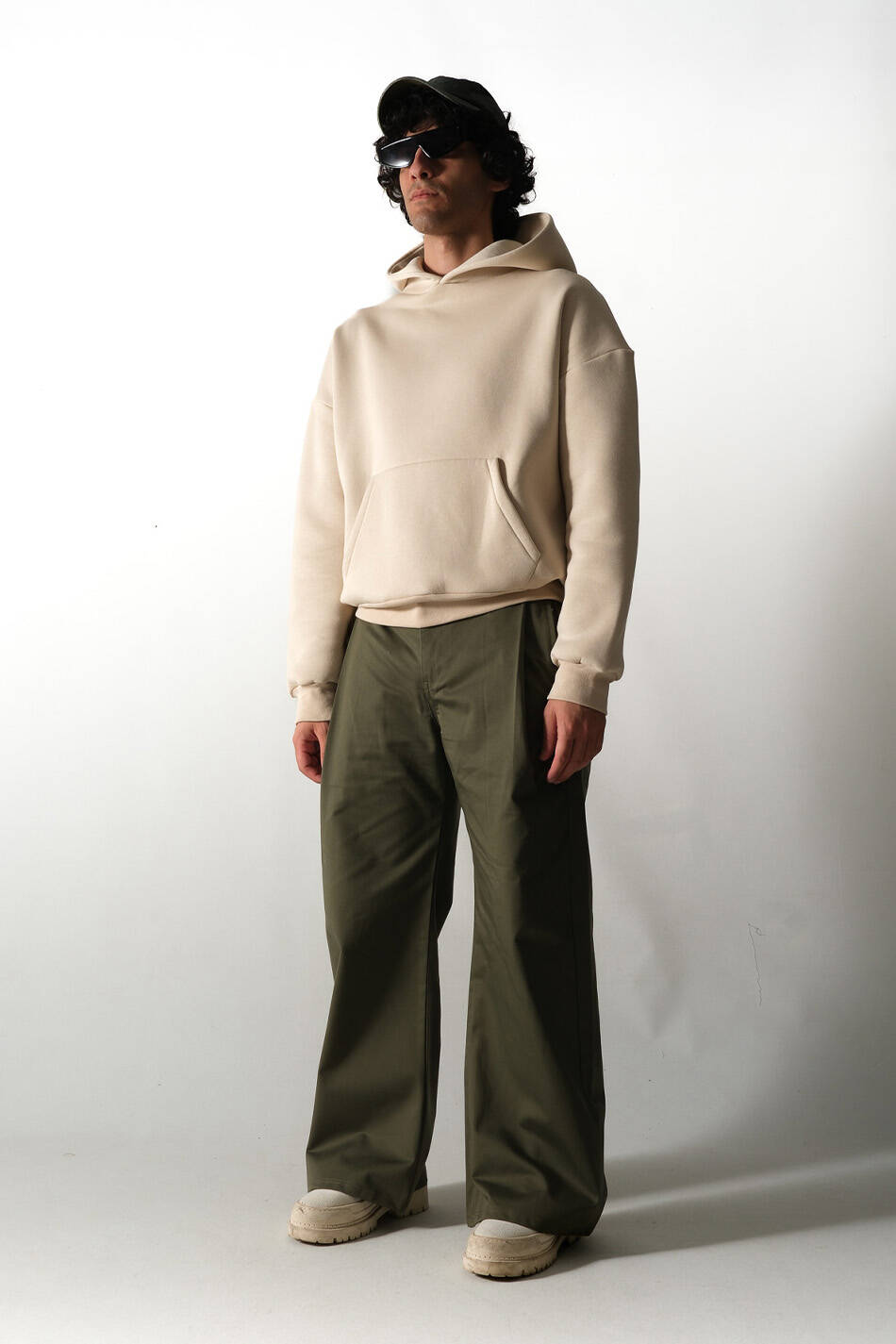 Pamuk karışımlı Oeko Tex sertifikalı kumaştan üretilmiş ve içi yumuşak tüylü orta kalınlıkta bej oversize boxy fit kapüşonlu sweatshirt. Kapüşonu astarlı, düşük omuzlu, uzun kollu, kanguru cepli, manşetleri ve etek ucu geniş ribanalı.