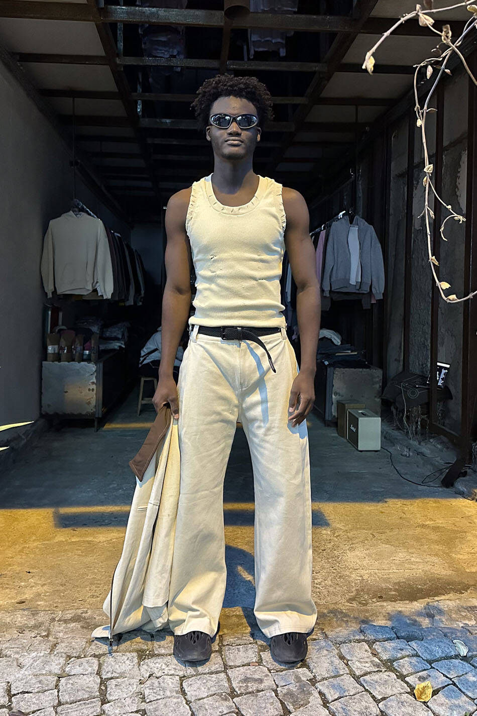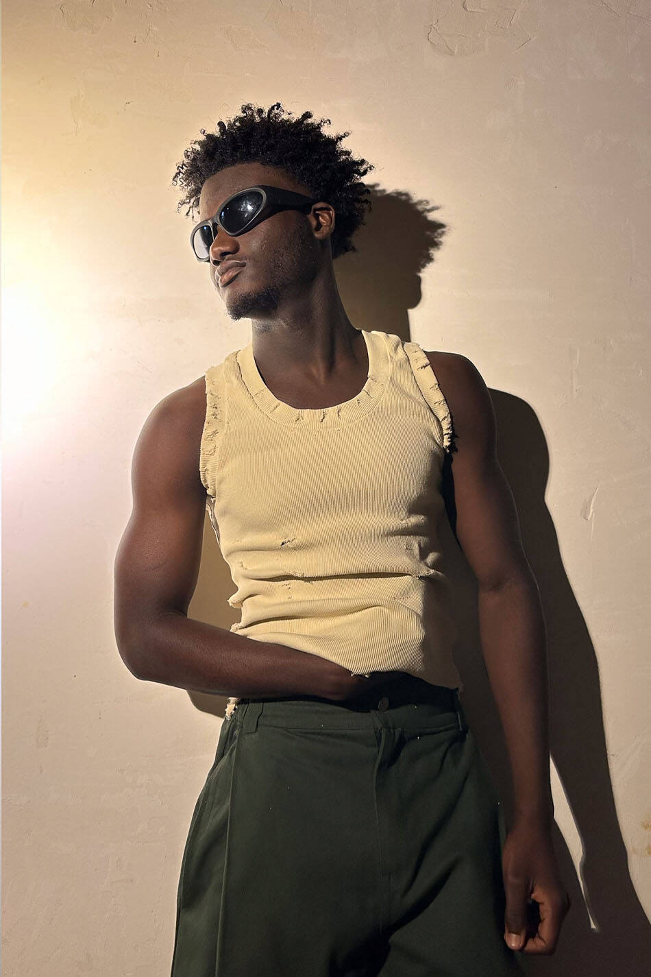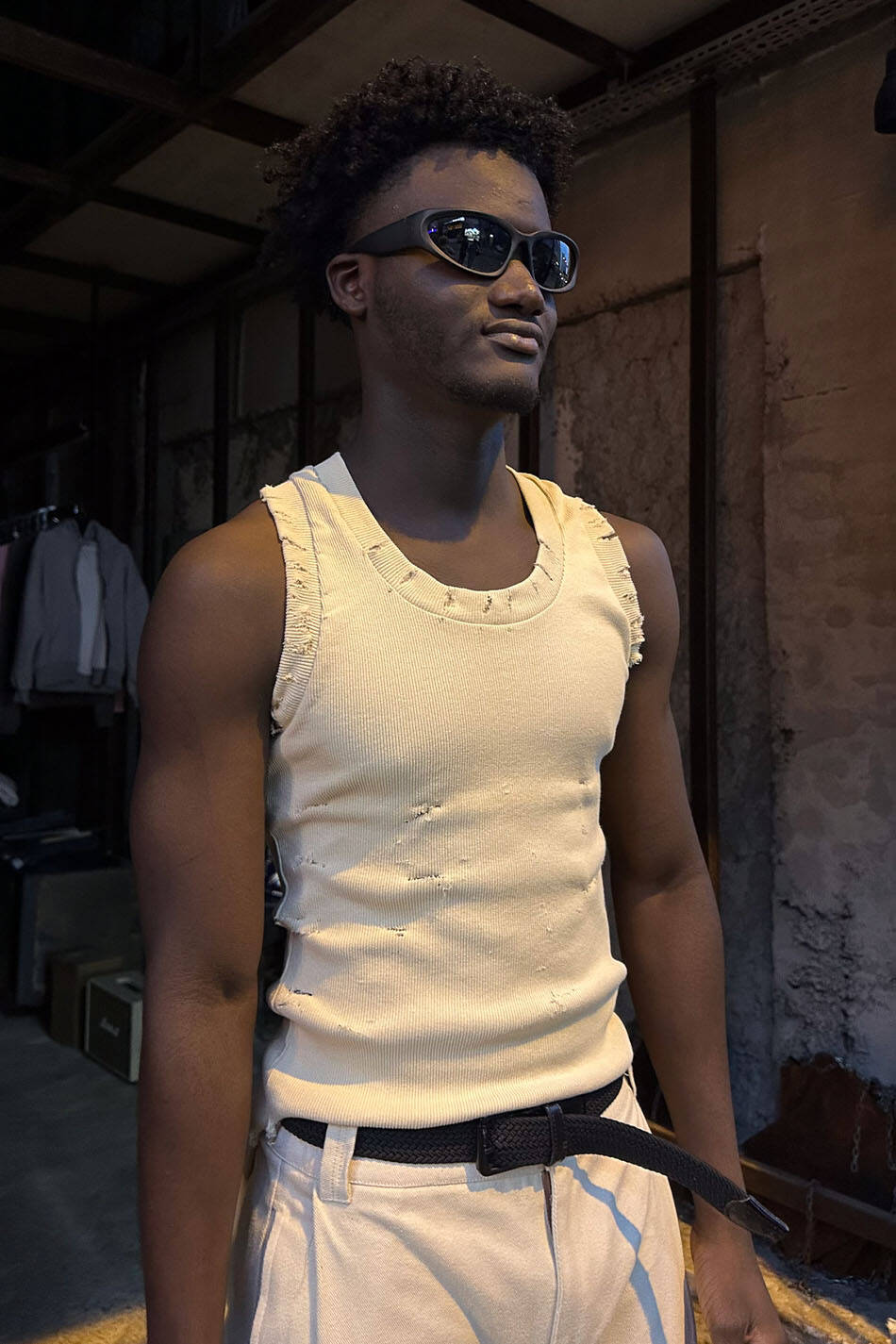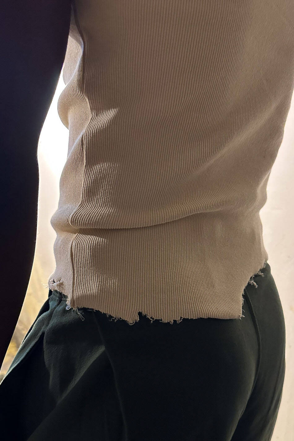 Distressed tank top atlet. Kol ağızları normal genişlikte, vücudunu saran yapıda, geniş yakalı, fitilli görünüme sahip atlet.