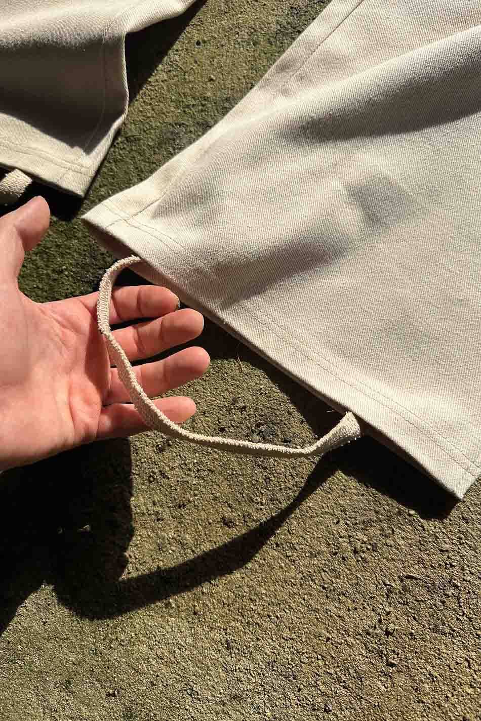 Çift Pileli Baggy Pantolon. 390gsm ağırlığında %100 pamuk gabardin kumaştan üretilmiştir. Bel kısmında yan taraflarda bulunan lastik ve kemer halkaları, farklı bedenler için rahat bir uyum sunar; belin bol veya sık olma sorunu ortadan kalkar. Yan kısımında bulunan çift pileli yapısı modern ile klasik arasında uyumu yakalayan bir görünüm oluşturur. Paçalarındaki şerit detayı paçanın arka kısmının yere değmemesini sağlar.