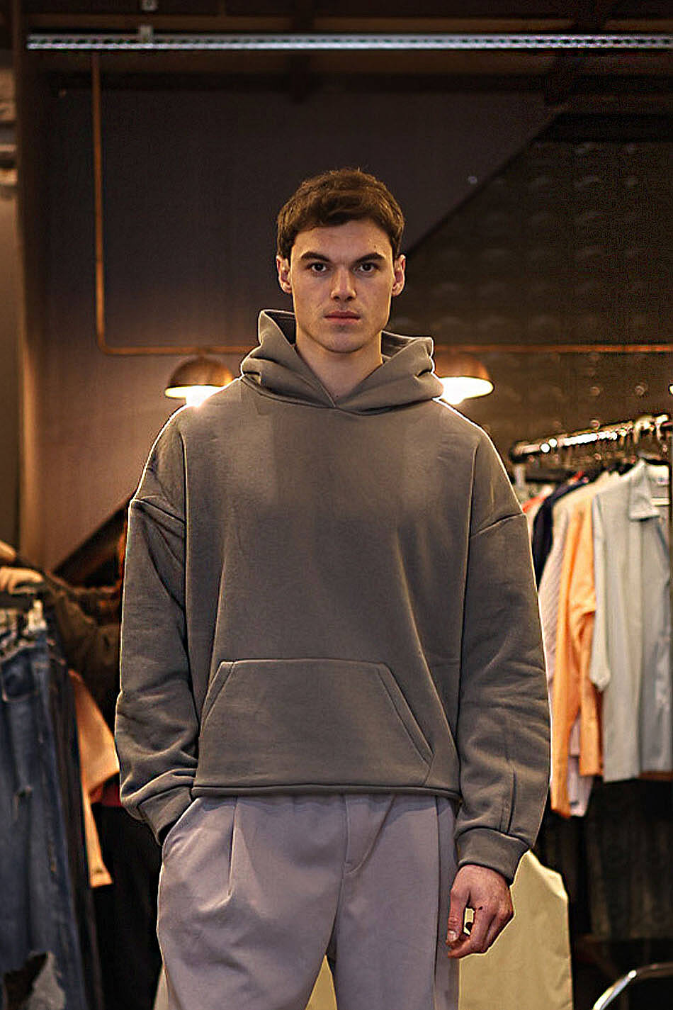 Pamuk karışımlı Oeko Tex sertifikalı kumaştan üretilmiş ve içi yumuşak tüylü orta kalınlıkta antrasit oversize boxy fit kapüşonlu sweatshirt. Kapüşonu astarlı, düşük omuzlu, uzun kollu, manşetleri ve etek ucu geniş ribanalı.