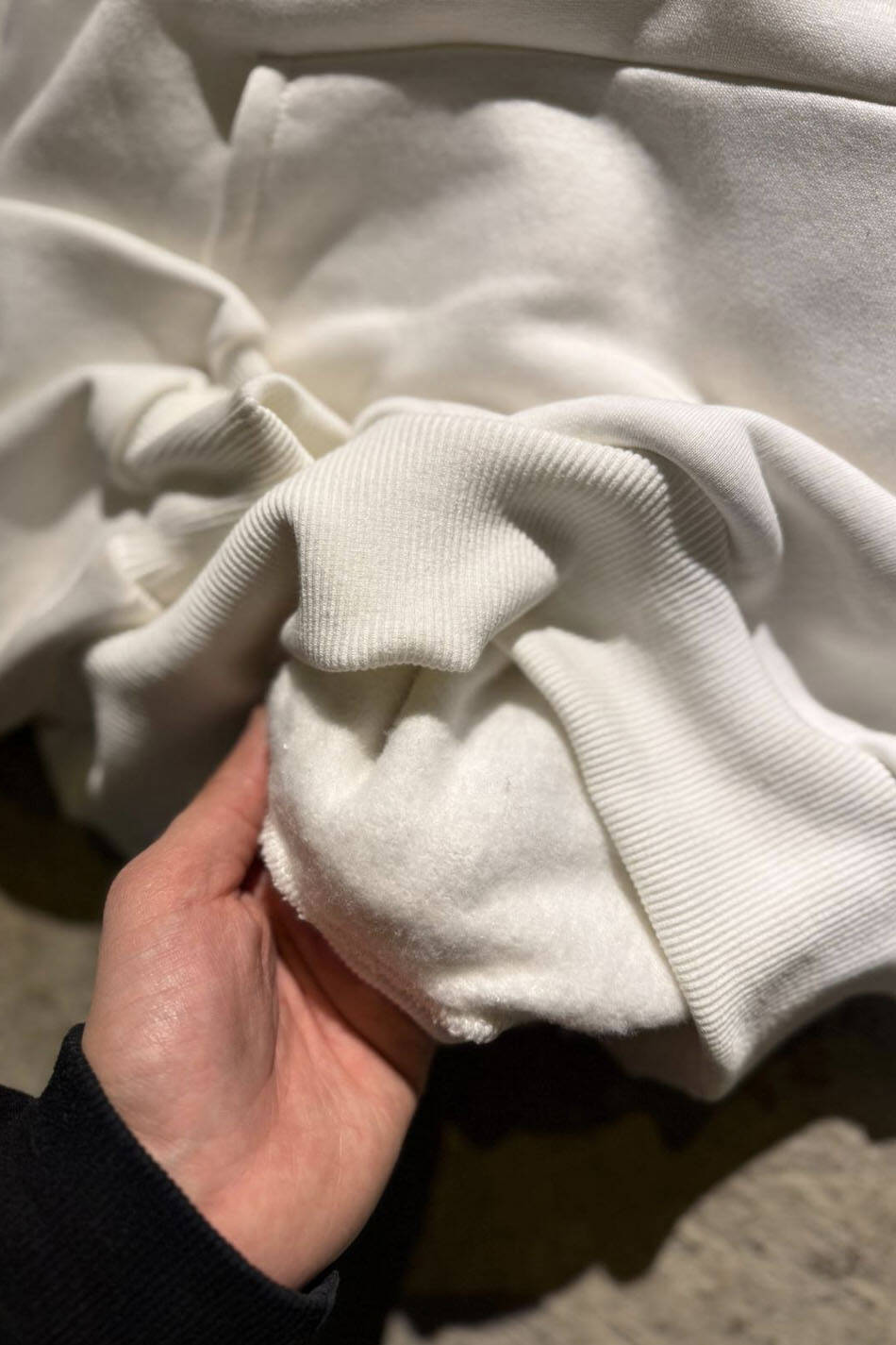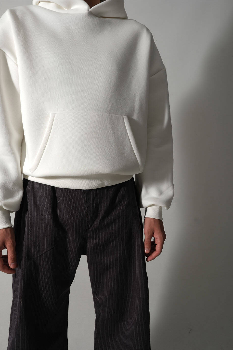 Pamuk karışımlı Oeko Tex sertifikalı kumaştan üretilmiş ve içi yumuşak tüylü orta kalınlıkta ekru oversize boxy fit kapüşonlu sweatshirt. Kapüşonu astarlı, düşük omuzlu, uzun kollu, kanguru cepli, manşetleri ve etek ucu geniş ribanalı.