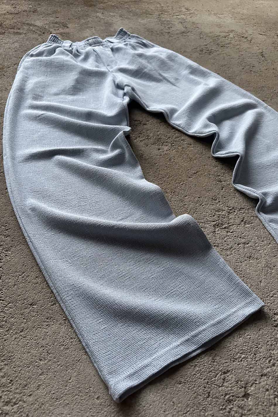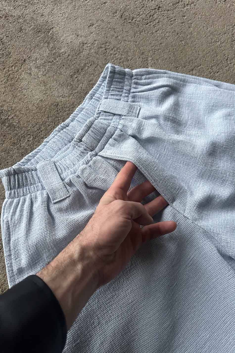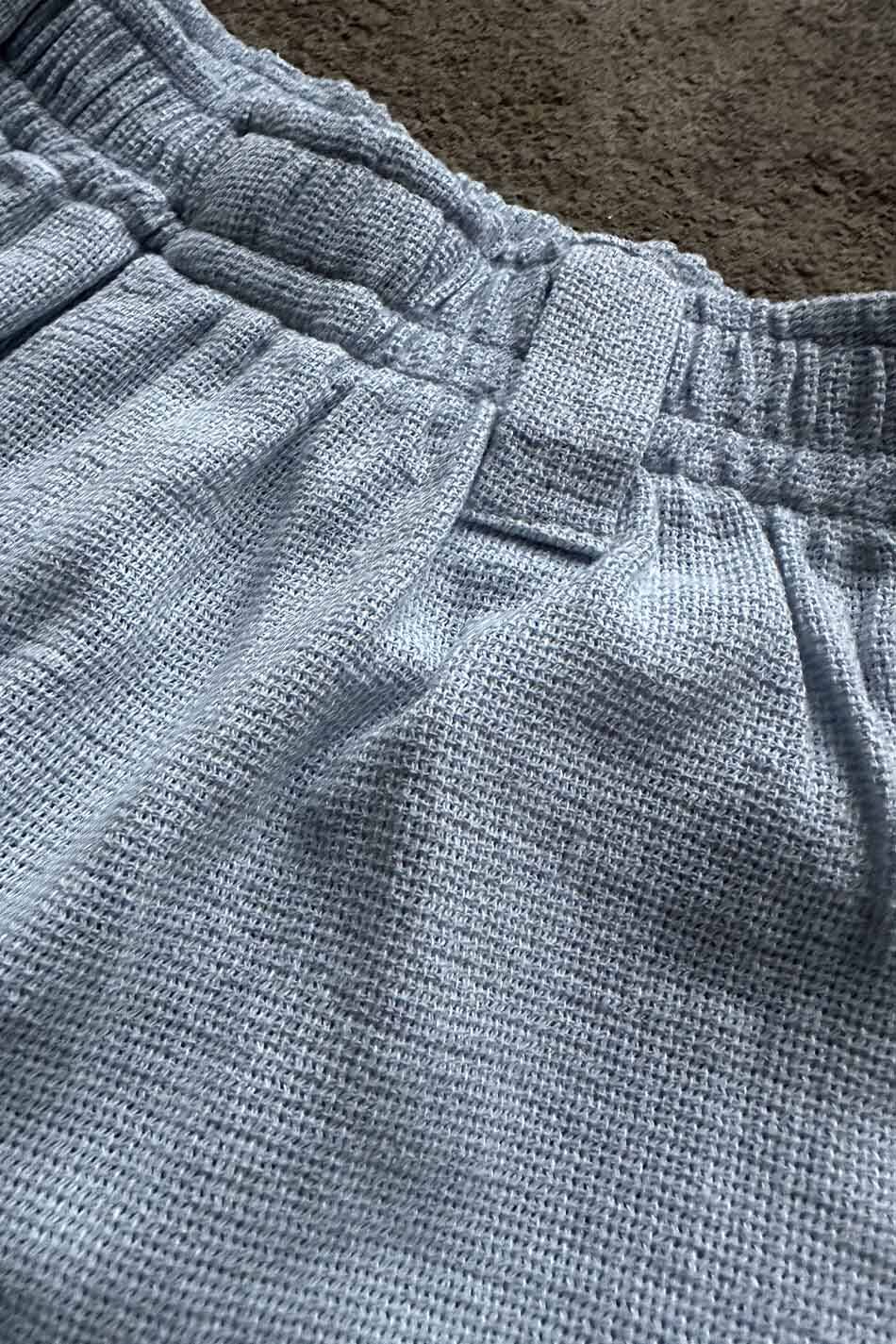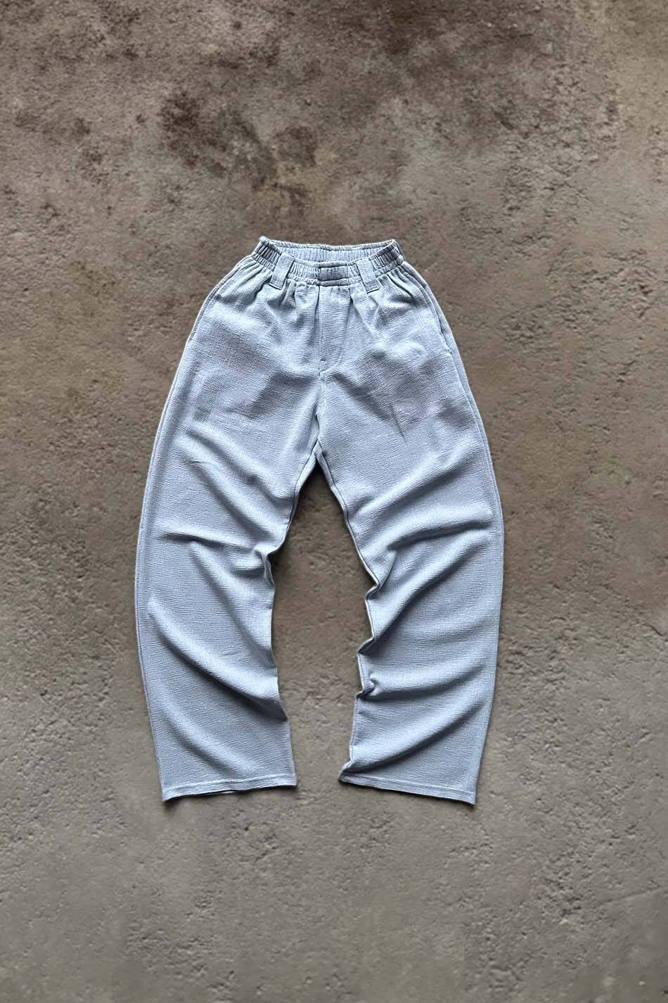 Özel dokulu kumaşı ve buz mavisi rengiyle hazırlanan bu pantolon, tam baggy kalıbı sayesinde geniş ve dökümlü bir silüet sunar. Bel bölgesinde yer alan lastik detayı kullanıcıya esneklik sağlar, kemer köprüleri ise fonksiyonel kullanım imkanı tanır. Kumaşın belirgin gözenekli yapısı hava sirkülasyonunu destekler ve dokulu yüzeyiyle farklı bir görünüm oluşturur.