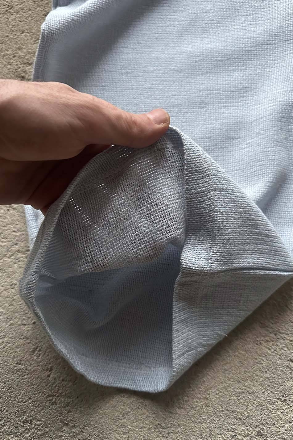 Buz mavisi dokulu kumaştan üretilen bu pantolon, tam baggy kalıbı ve dökümlü kesimiyle geniş bir kullanım alanı sunar. Lastikli bel yapısı ve kemer köprüleri mevcuttur. Belirgin gözenekli kumaşı, hava almasını sağlar ve ürünün formunu korur. Bol kesimiyle hareket özgürlüğünü destekleyen ürün, hafif daralan paça yapısı sayesinde hem bol hem de düzgün durur; ayakkabının üzerine potluk yapmadan düzgün bir görüntü sağlar.