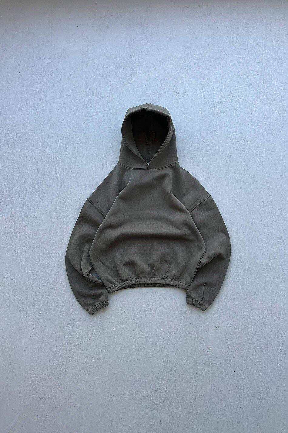 Pamuk karışımlı Oeko Tex sertifikalı kumaştan üretilmiş ve içi yumuşak tüylü orta kalınlıkta antrasit oversize boxy fit kapüşonlu sweatshirt. Kapüşonu astarlı, düşük omuzlu, uzun kollu,  manşetleri ve etek ucu lastikli.