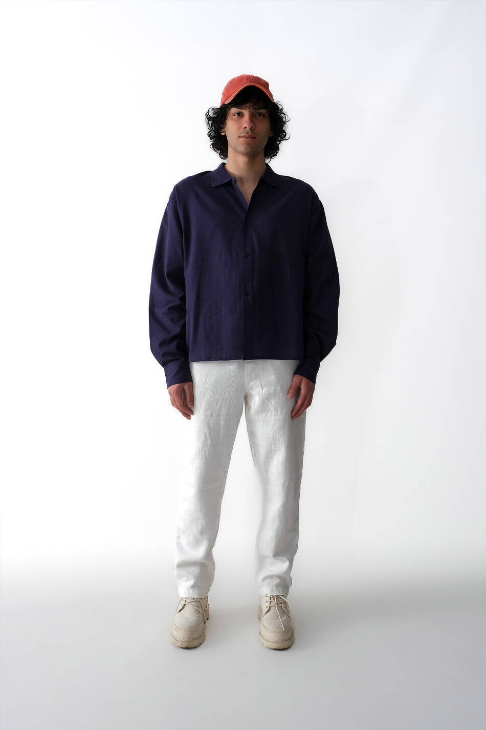 Gece Mavisi Boxy Fit Crop Pamuk Gömlek. %100 doğal organik pamuklu ince kumaştan üretilmiştir. Düğmeli manşetleri ve önden tam düğme kapamalı tasarımıyla klasik bir silüete sahiptir. Etek ucu düz kesim olup, bol kesimi sayesinde rahat bir kullanım sunar.
