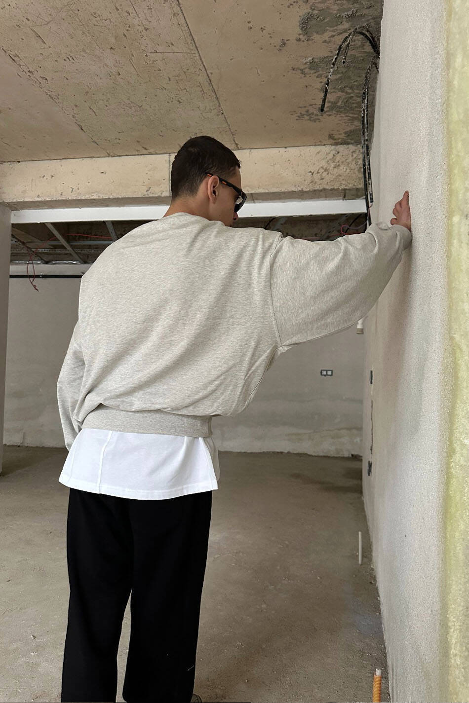 Gri Melanj Extra Oversize Boxy Fit Sweatshirt. Oeko Tex sertifikalı %100 pamuklu kumaştan üretilmiştir. Düşük omuzlu, bisiklet yaka, crop kesime sahip extra oversize gri melanj sweathirt