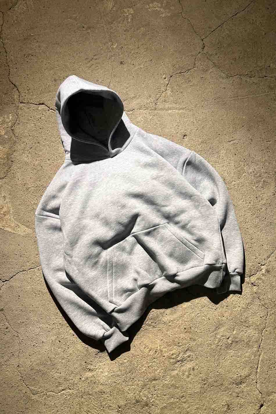 Pamuk karışımlı Oeko Tex sertifikalı kumaştan üretilmiş ve içi yumuşak tüylü orta kalınlıkta gri melanj oversize boxy fit kapüşonlu sweatshirt. Kapüşonu astarlı, düşük omuzlu, uzun kollu, kanguru cepli, manşetleri ve etek ucu geniş ribanalı.
