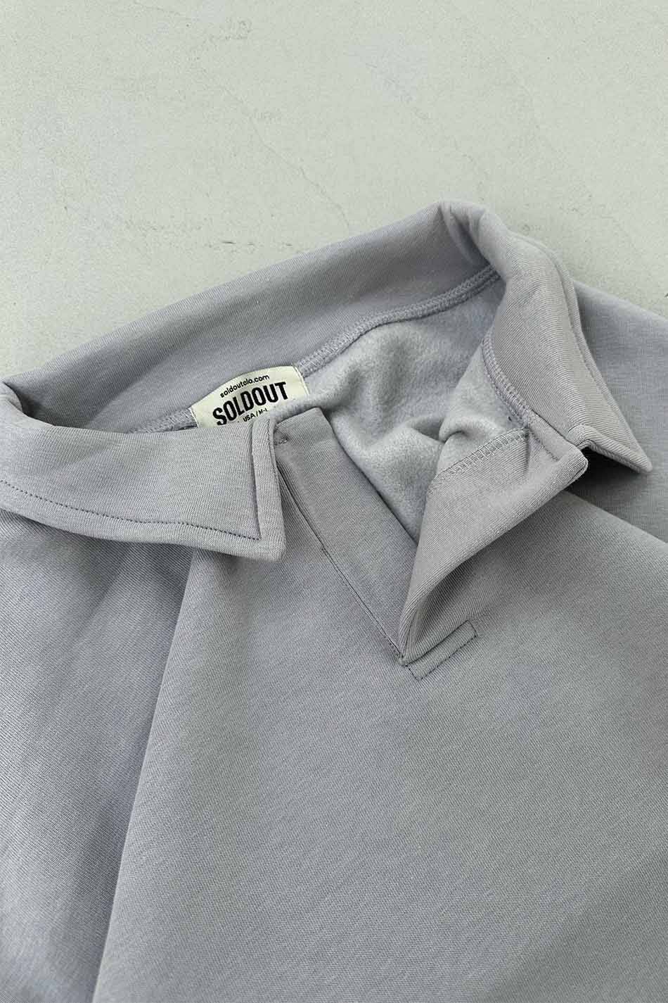 Pamuk karışımlı Oeko Tex sertifikalı kumaştan üretilmiş ve içi yumuşak tüylü orta kalınlıkta  oversize sweatshirt.Düşük omuzlu, uzun kollu,  manşetleri ve etek uçları esnek kumaştan üretilmiş, bol kesim, yakasında üçgen dokuma detayı bulunan polo yaka sweatshirt.