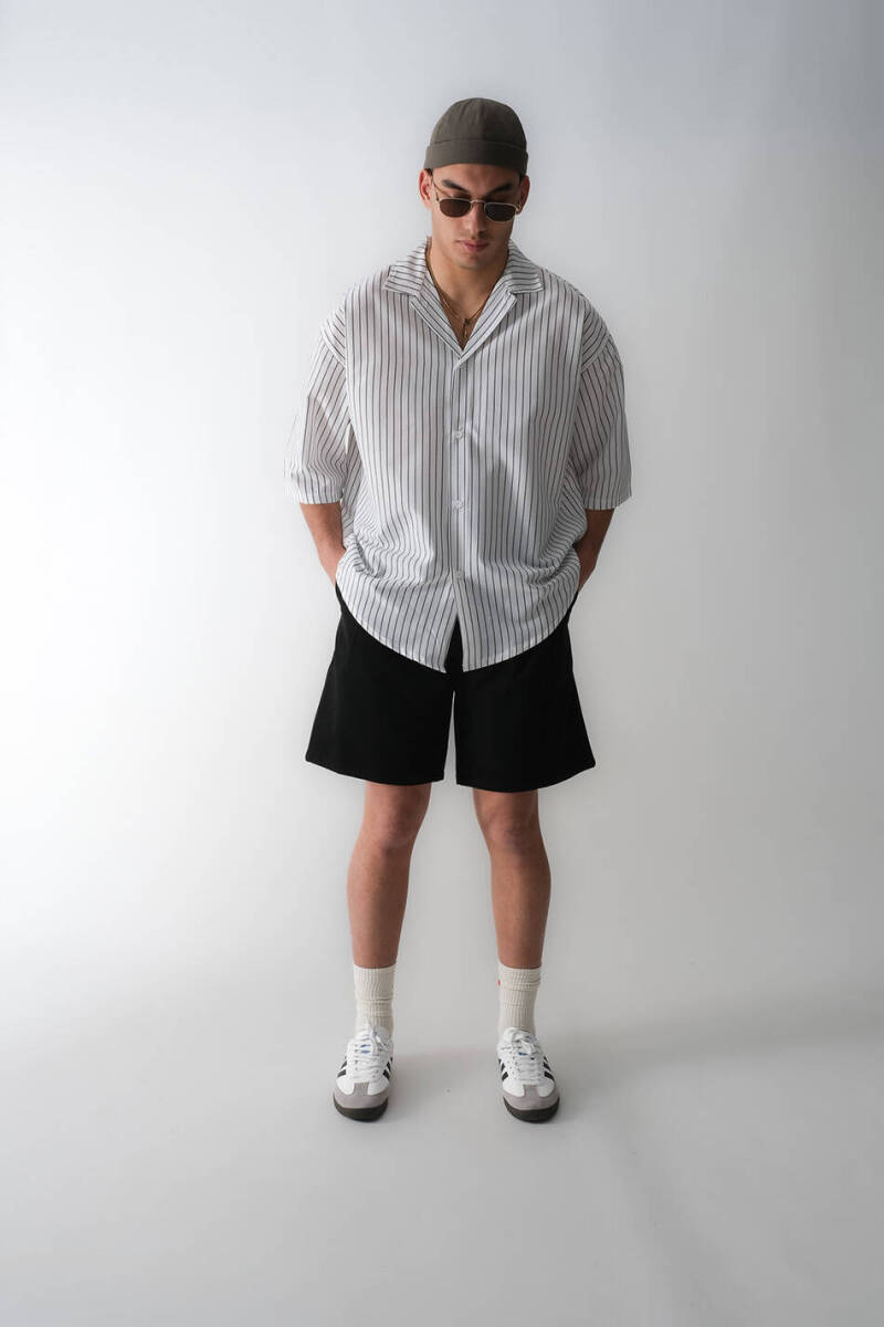 Çizgili oversize old money gömlek. Pamuklu kumaştan üretilmiş, yarım kollu dikey çizgili oversize gömlek. Düğmeli manşetleri ve önden tam düğme kapamalı tasarımıyla klasik bir silüete sahiptir. Etek ucu yuvarlak kesim olup, bol kesimi sayesinde rahat bir kullanım sunar.