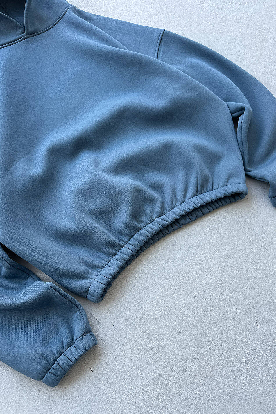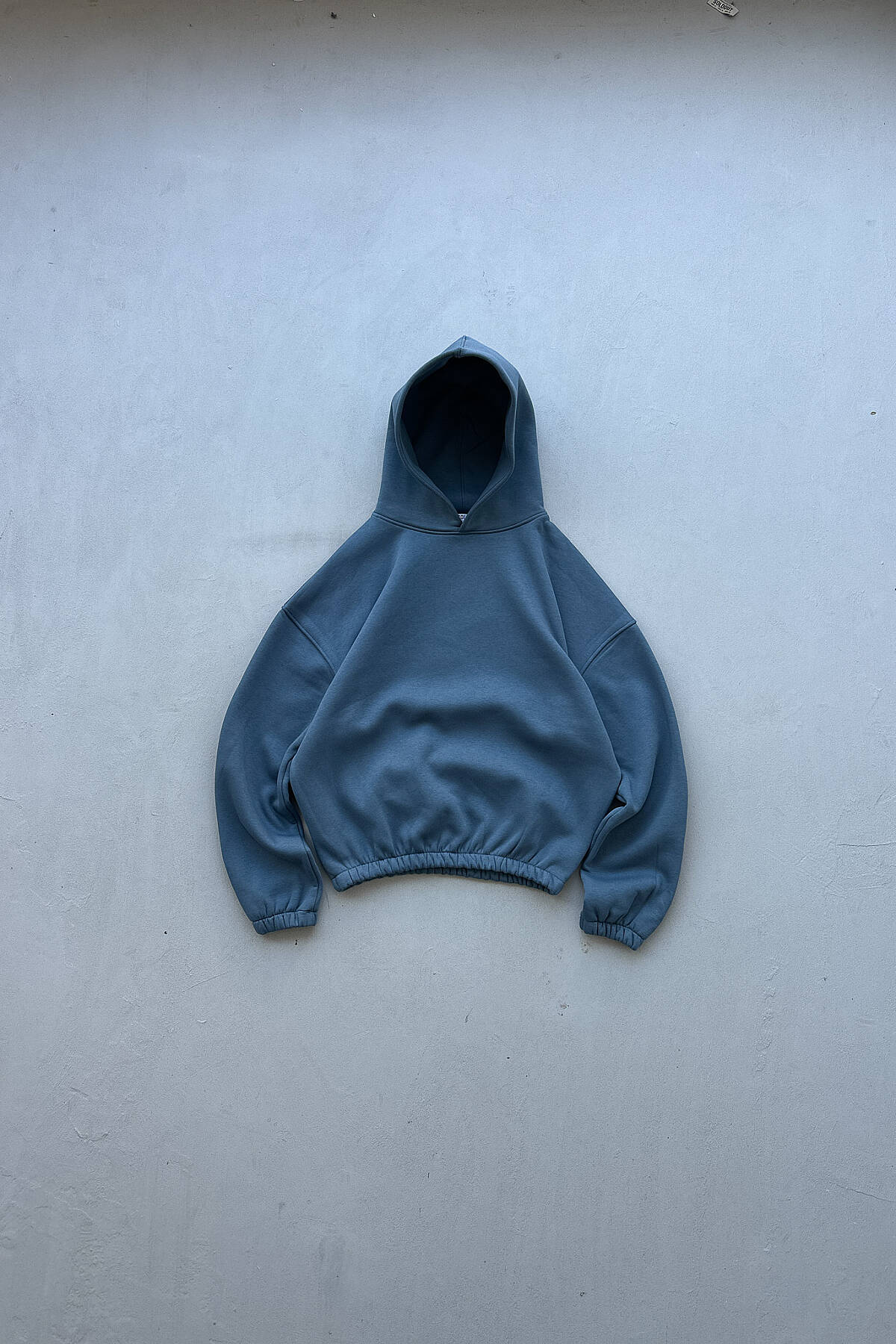 Pamuk karışımlı Oeko Tex sertifikalı kumaştan üretilmiş ve içi yumuşak tüylü orta kalınlıkta antrasit oversize boxy fit kapüşonlu sweatshirt. Kapüşonu astarlı, düşük omuzlu, uzun kollu,  manşetleri ve etek ucu lastikli.