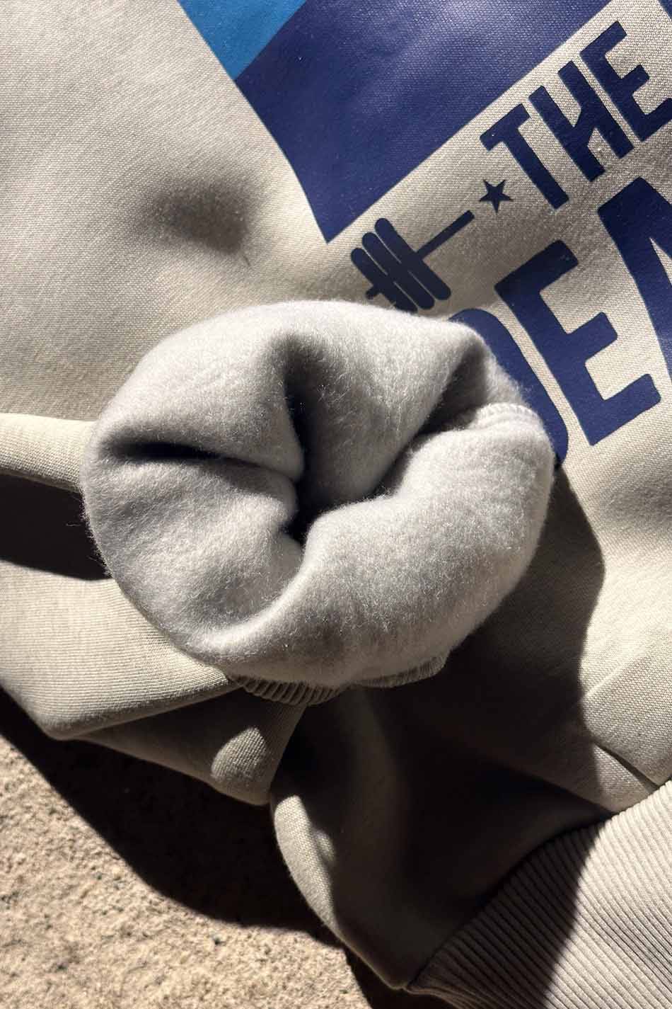 Pamuk karışımlı Oeko Tex sertifikalı kumaştan üretilmiş ve içi yumuşak tüylü orta kalınlıkta taş rengi oversize boxy fit kapüşonlu sweatshirt. Kapüşonu astarlı, düşük omuzlu, uzun kollu, kanguru cepli, manşetleri ve etek ucu geniş ribanalı.