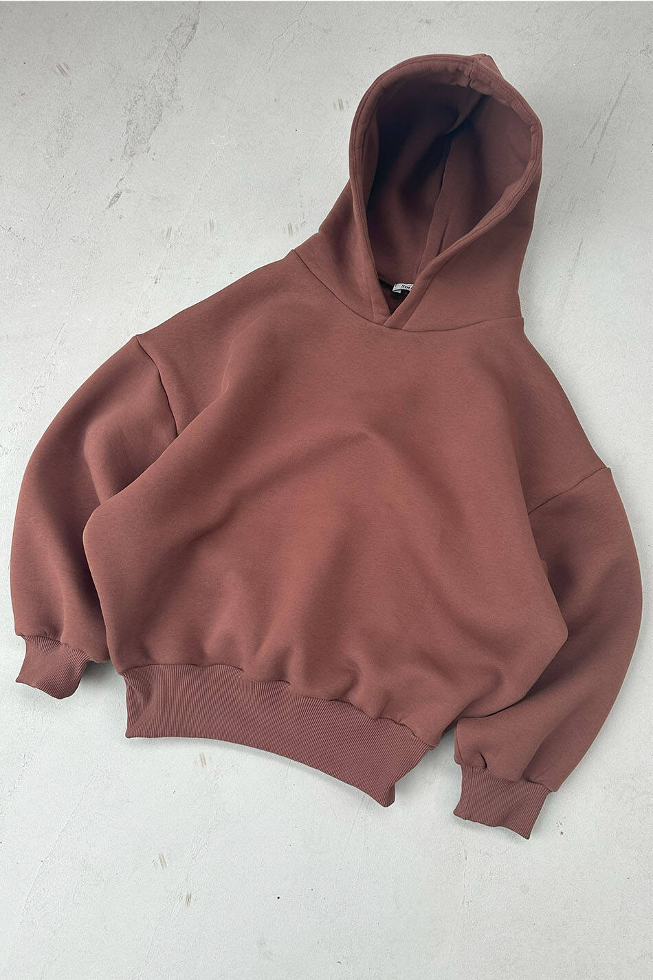Pamuk karışımlı Oeko Tex sertifikalı kumaştan üretilmiş ve içi yumuşak tüylü orta kalınlıkta oversize boxy fit kapüşonlu sweatshirt. Kapüşonu astarlı, düşük omuzlu, uzun kollu, kanguru cepli, manşetleri ve etek ucu geniş ribanalı.