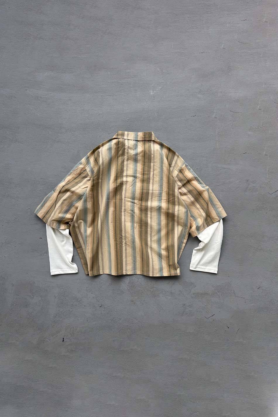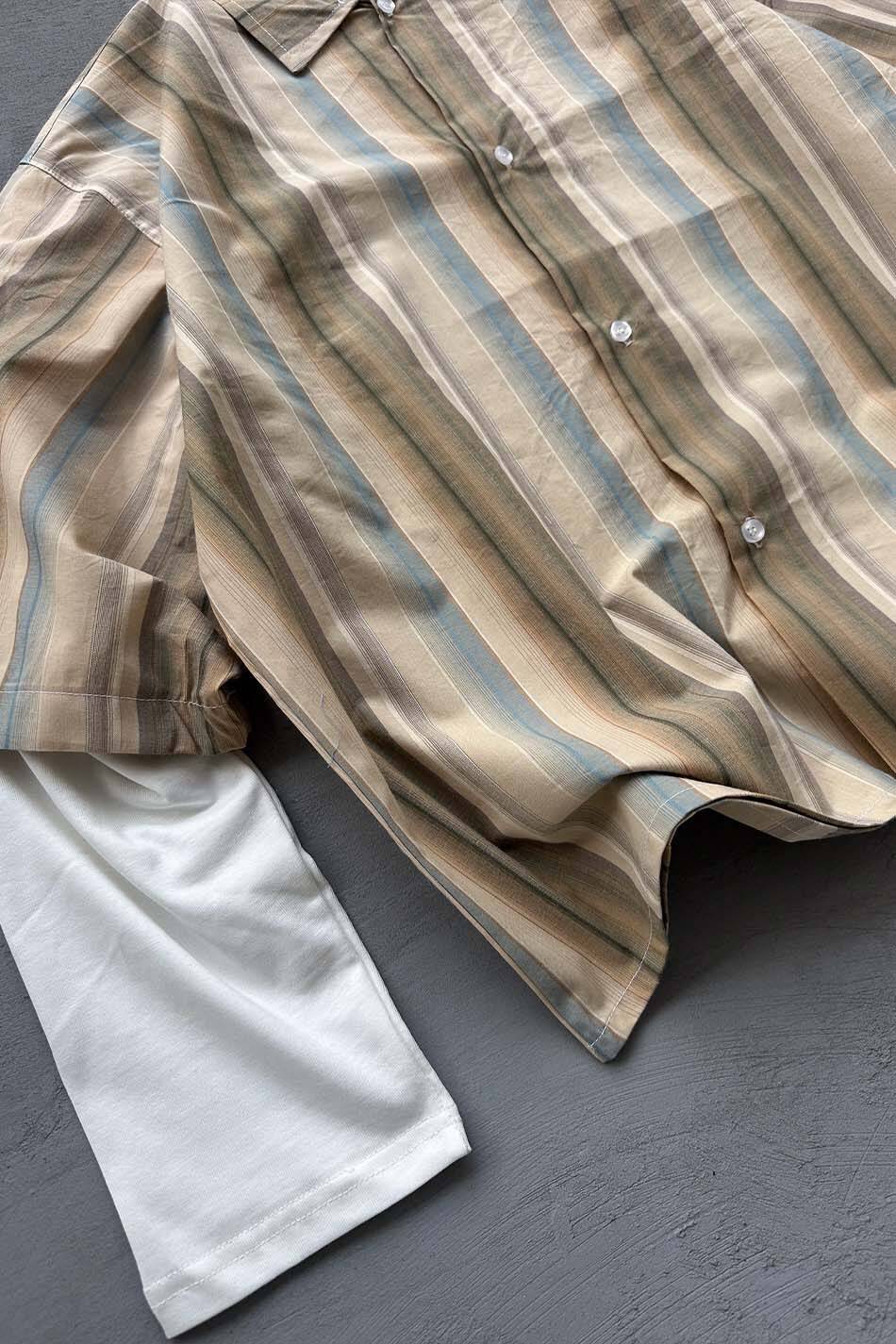 Kendinden katmanlı (layered) tasarımıyla gömlek kollarının içinden beyaz uzun kollu tişört parçası çıkmaktadır. Geniş ve kısa (boxy fit) kalıbıyla dökümlü bir kullanım sunan ürün, önden tam düğme kapamalıdır.