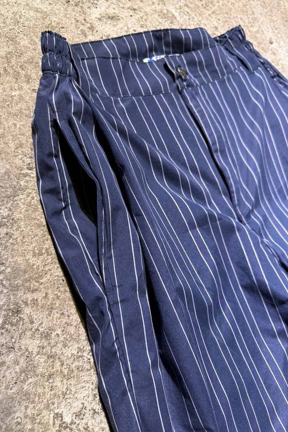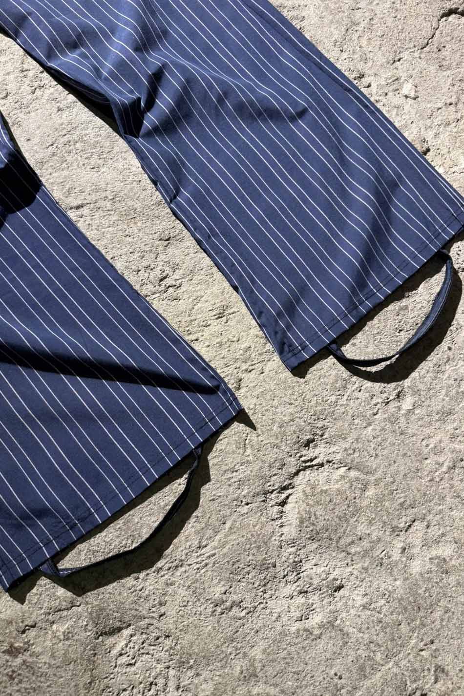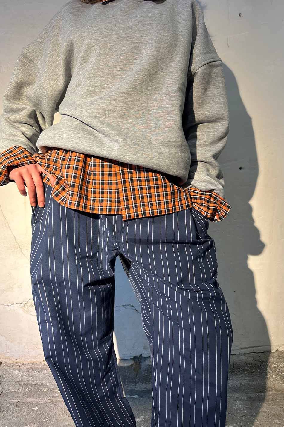 Lacivert Çizgili Çift Pileli Baggy Pantolon. Bel kısmında yan taraflarda bulunan lastik ve kemer halkaları, farklı bedenler için rahat bir uyum sunar; belin bol veya sık olma sorunu ortadan kalkar. Yan kısımında bulunan çift pileli yapısı modern ile klasik arasında uyumu yakalayan bir görünüm oluşturur. Paçalarındaki şerit detayı paçanın arka kısmının yere değmemesini sağlar.