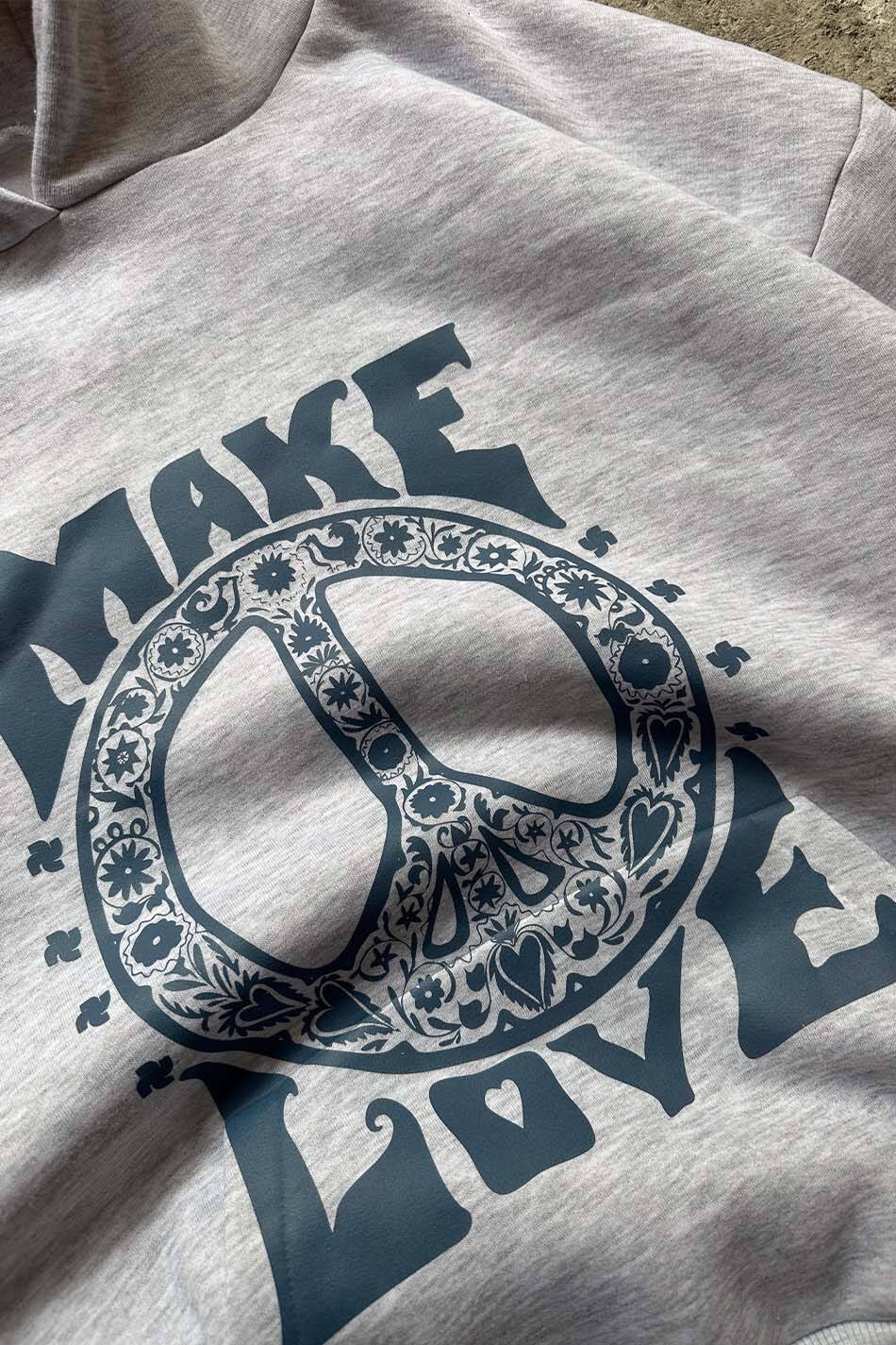 Pamuk karışımlı Oeko Tex sertifikalı kumaştan üretilmiş ve içi yumuşak tüylü orta kalınlıkta gri melanj oversize boxy fit kapüşonlu sweatshirt. Kapüşonu astarlı, düşük omuzlu, uzun kollu, kanguru cepli, manşetleri ve etek ucu geniş ribanalı.