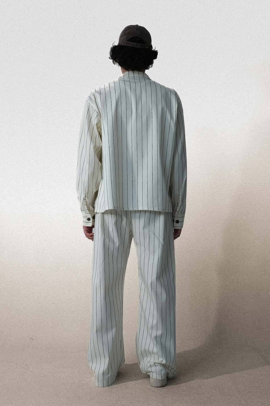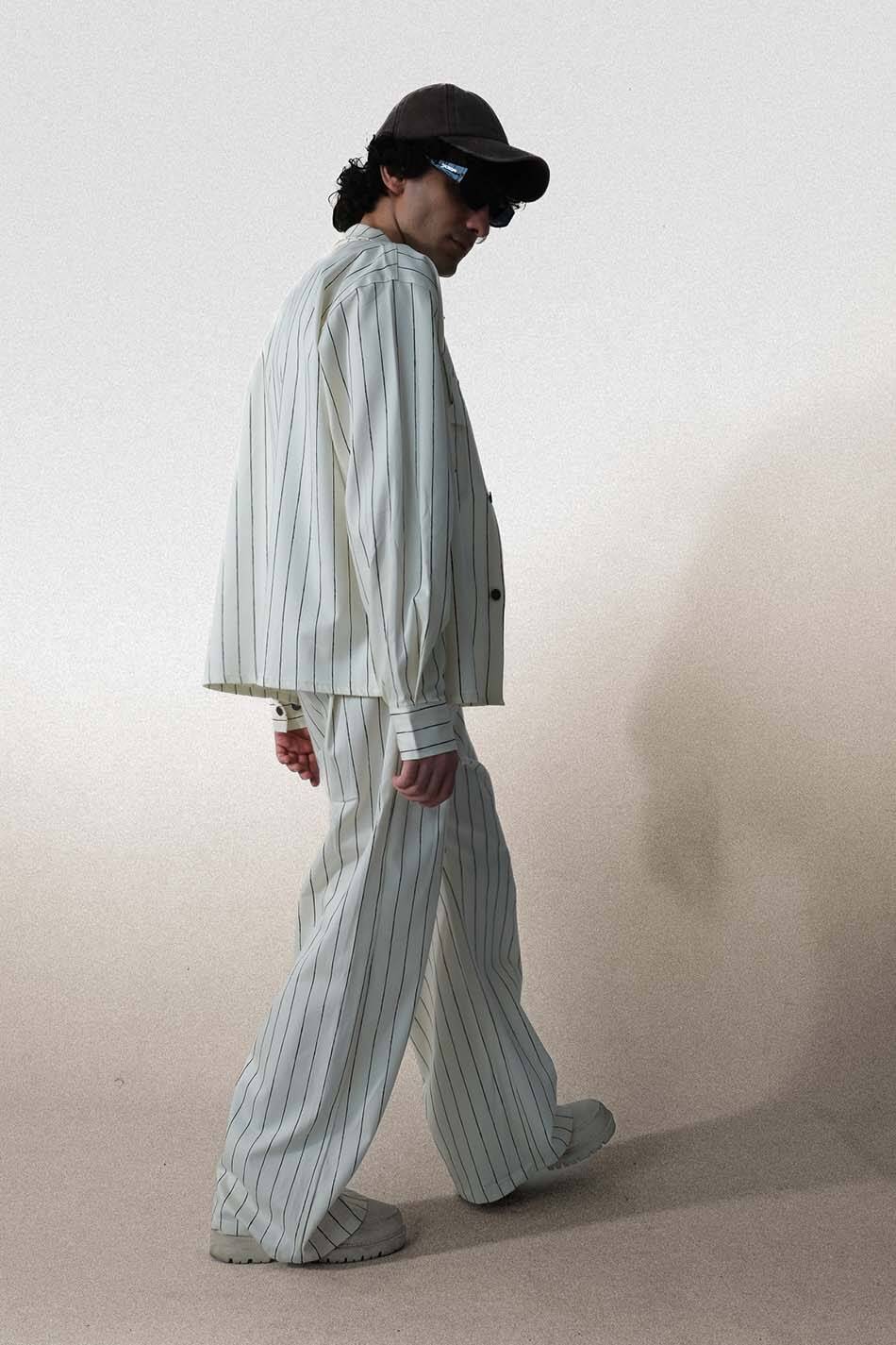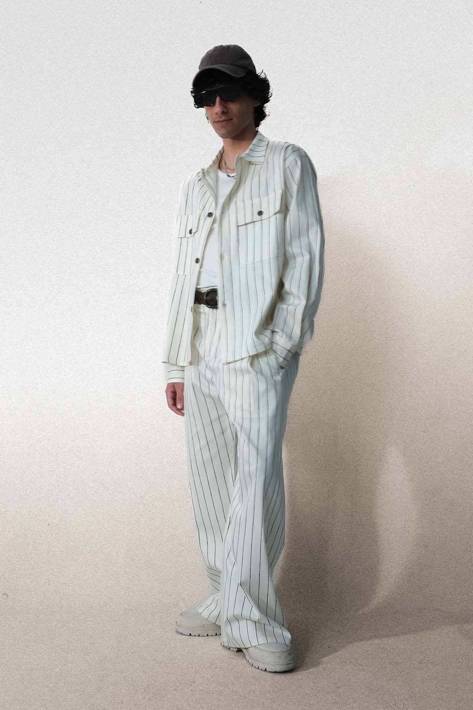 Siyah çizgili ekru oversize ceket, gabardin kumaştan üretilmiştir. Ön yüzünde düğme kapama, göğüs kısmında düğmeli kapaklı çift torba cep bulunmaktadır. Manşetler düğme kapamalıdır. Dikey çizgili yapıya sahip olup, etek ucu düz kesimdir.