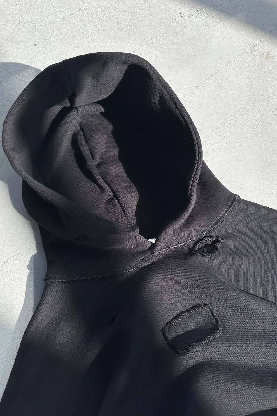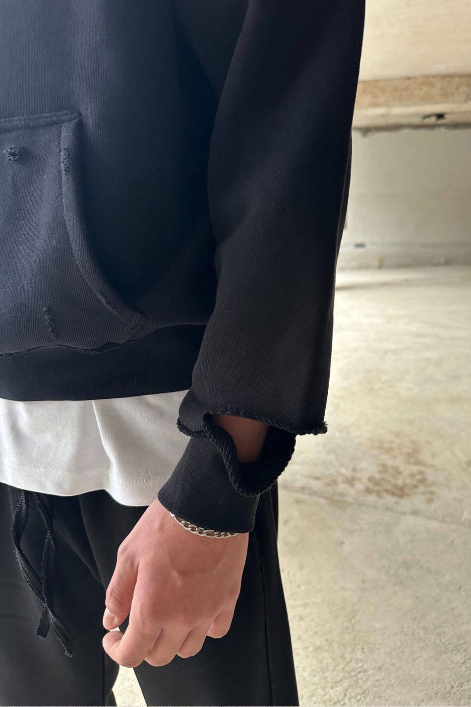 Siyah Distressed Oversize Boxy Fit Hoodie. Oeko Tex sertifikalı %100 pamuklu, 450gsm ağırlığında, şardonsuz, diagonel kumaştan üretilmiştir. Kanguru cepli, göğüs kısmında dikdörtgen dikiş detaylı, düşük omuzlu. Distressed yapısıyla ve ters dikiş detaylarıyla özgün bir görünüm kazandırılmıştır.Tamamen el işçiliği ile yıpratma işlemi uygulanmıştır.