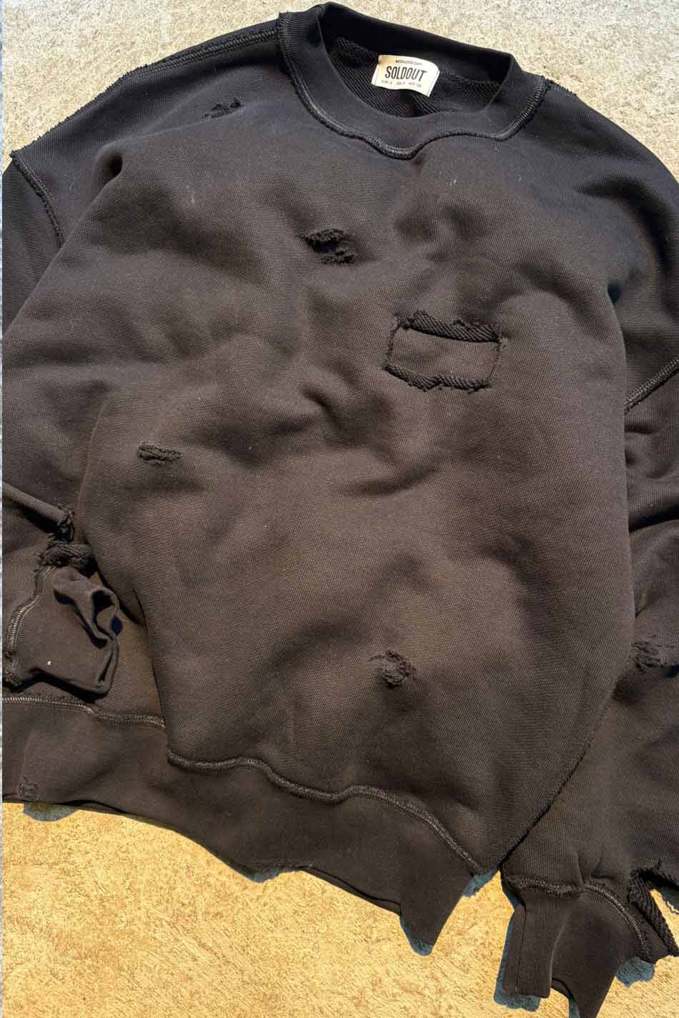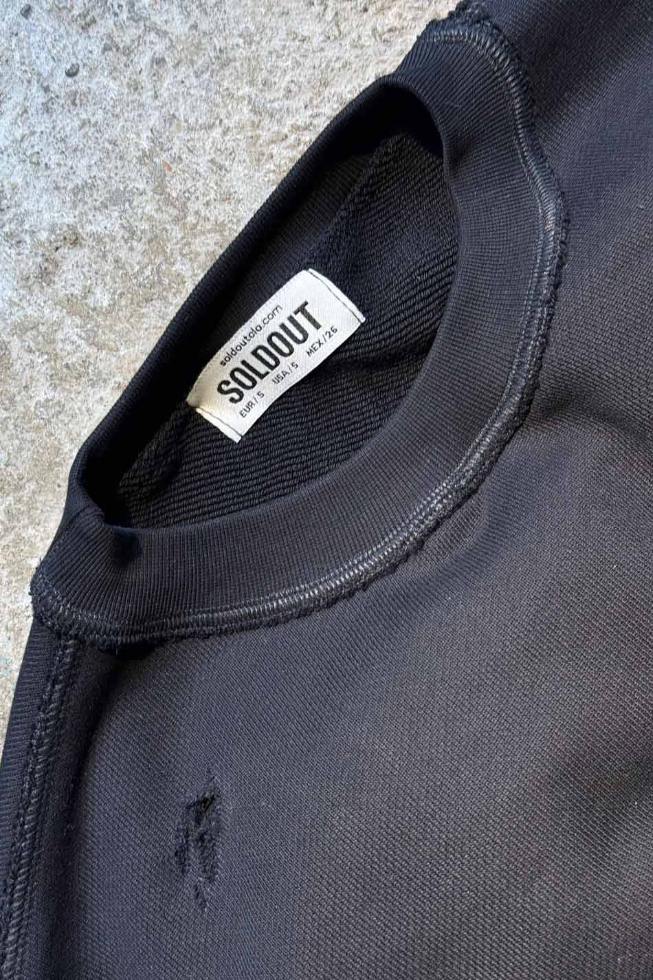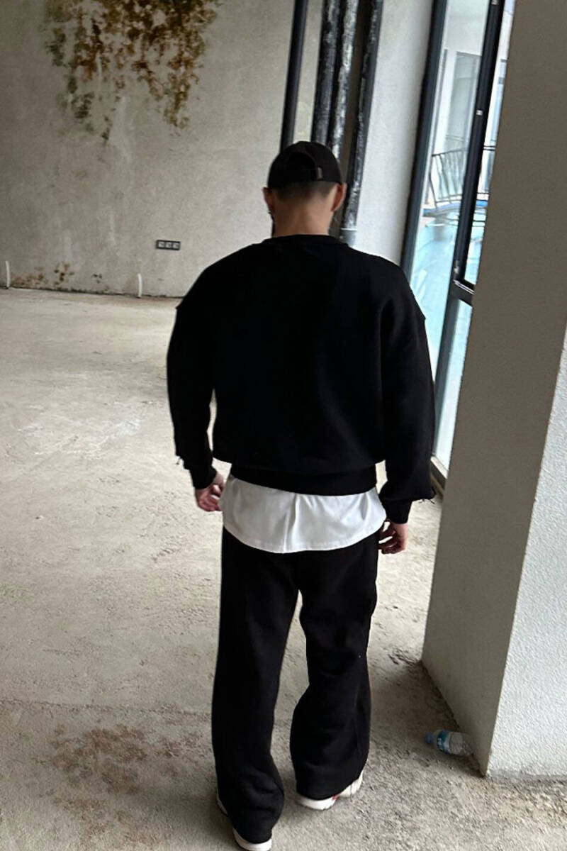 Siyah Distressed Oversize Boxy Fit Sweatshirt. Oeko Tex sertifikalı %100 pamuklu, 450gsm ağırlığında, şardonsuz, diagonel kumaştan üretilmiştir. Göğüs kısmında dikdörtgen dikiş detaylı, düşük omuzlu. Distressed yapısıyla ve ters dikiş detaylarıyla özgün bir görünüm kazandırılmıştır.Tamamen el işçiliği ile yıpratma işlemi uygulanmıştır.