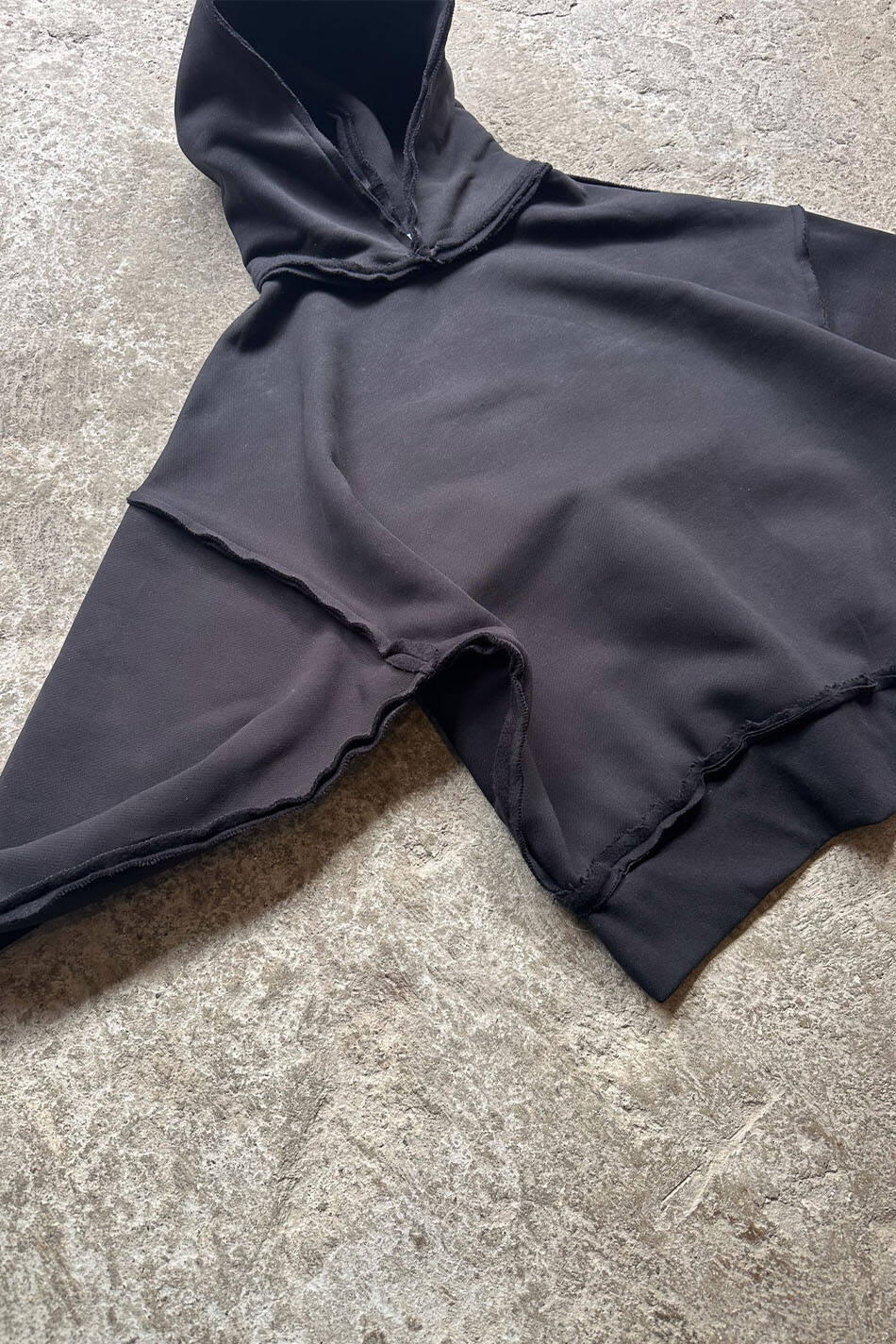 %100 pamuk, ağır ve kalın, sık dokulu, hafif şardonlu, 550 gsm Oeko Tex sertifikalı kumaştan üretilmiş pis dikiş detaylarına sahip ekstra oversize boxy fit kapüşonlu sweatshirt. Kapüşonu astarlı, düşük omuzlu, uzun kollu, manşetleri ve etek ucu geniş ribanalı.
