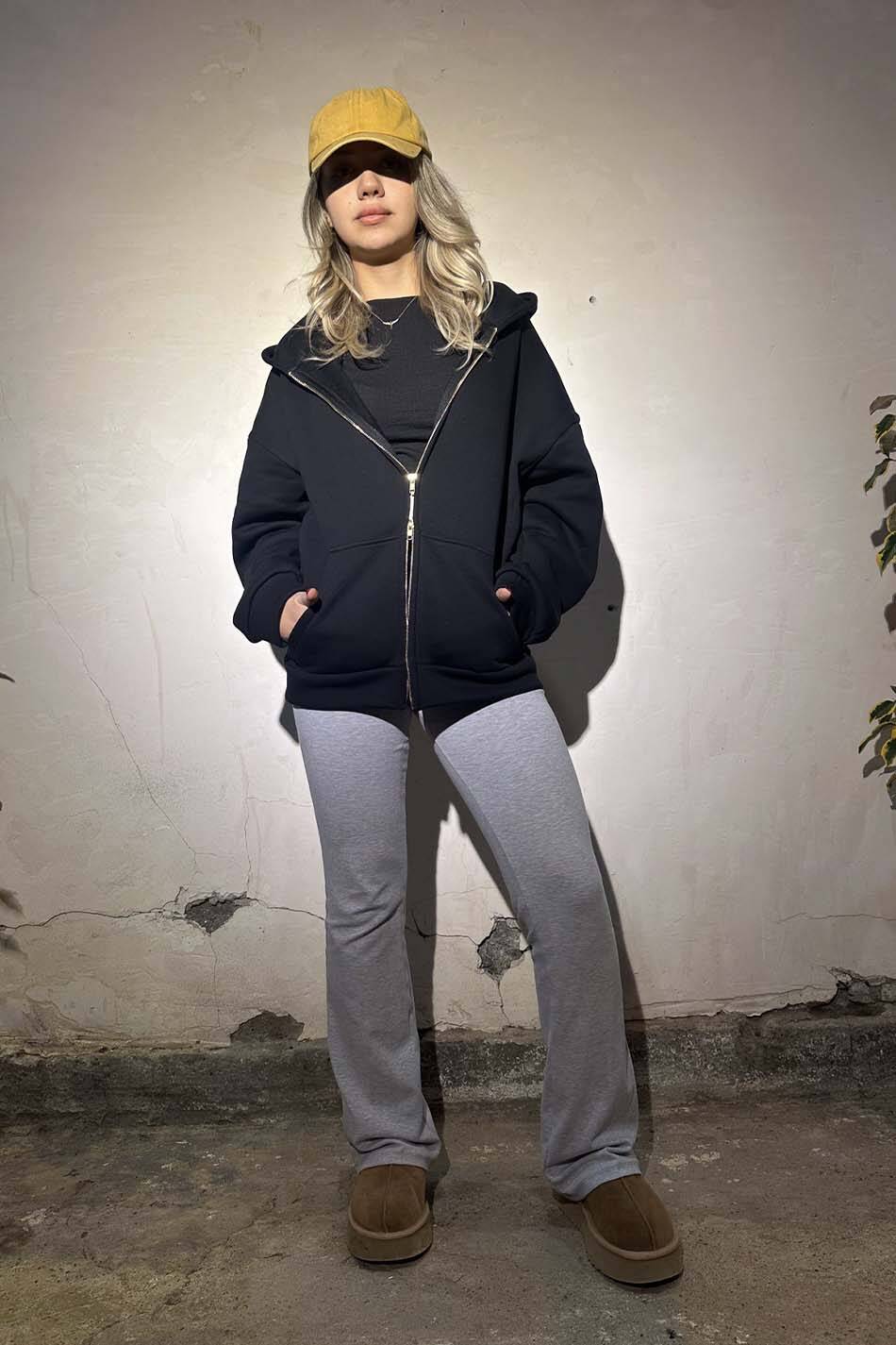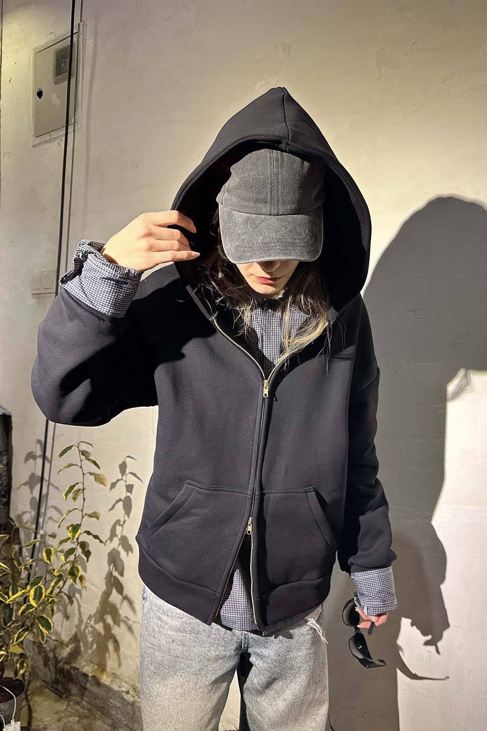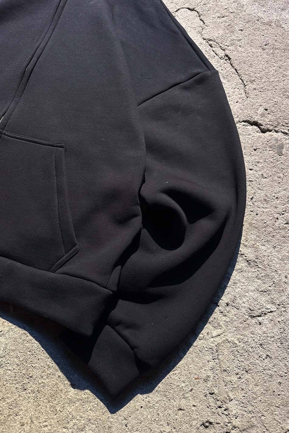 %100 pamuk, ağır ve kalın, sık dokulu, hafif şardonlu, 500 gsm Oeko Tex sertifikalı kumaştan üretilmiş oversize boxy fit kapüşonlu zip hoodie. Kapüşonu astarlı, düşük omuzlu, uzun kollu, kanguru cepli, manşetleri ve etek ucu düz kesimli.