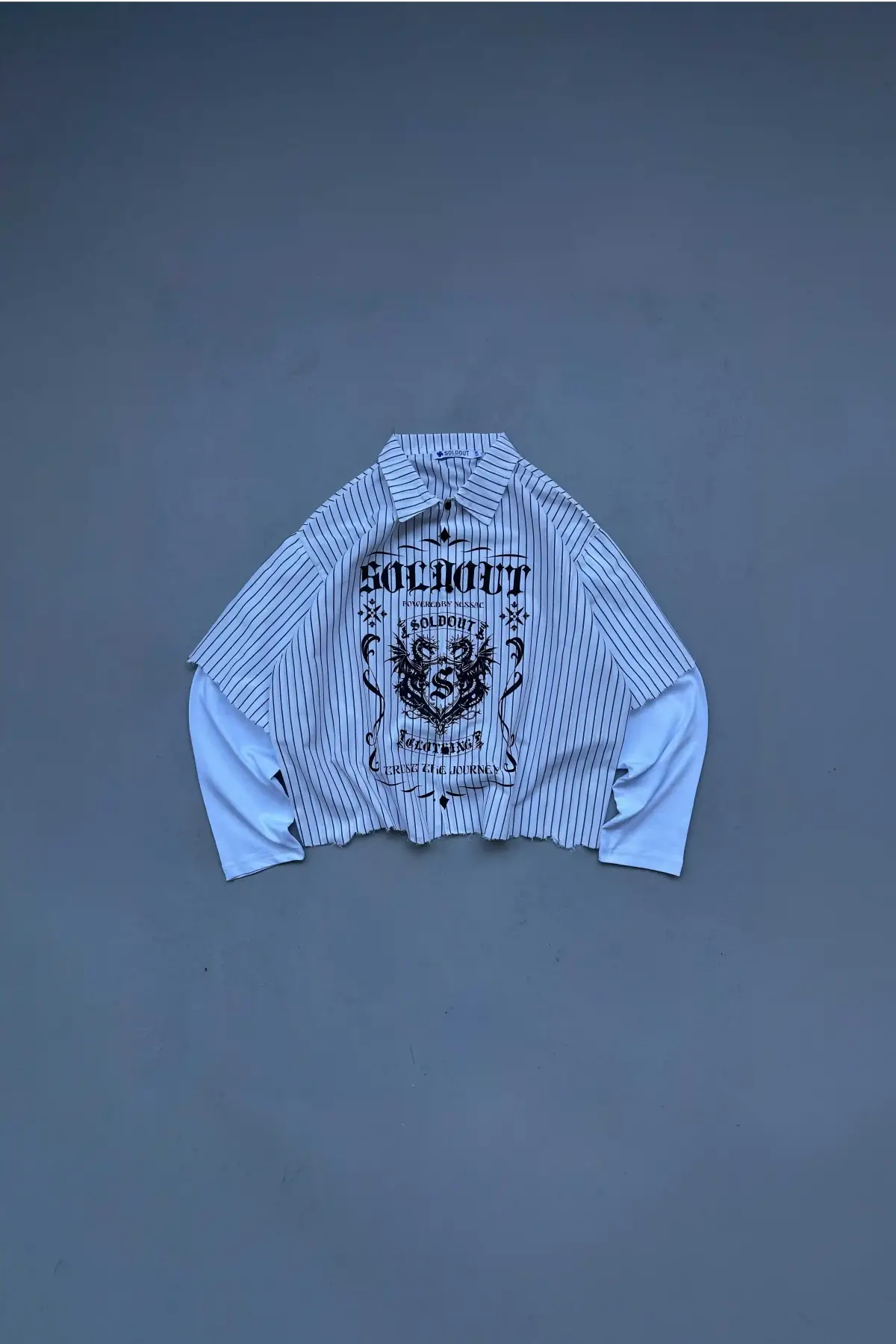 Kendinden katmanlı (layered) tasarımıyla gömlek kollarının içinden beyaz uzun kollu tişört parçası çıkmaktadır. Ürünün ön kısmında DTF yöntemiyle uygulanmış baskı yer alır. Geniş ve kısa (boxy fit) kalıbıyla dökümlü bir kullanım sunan ürün, önden tam düğme kapamalıdır.
