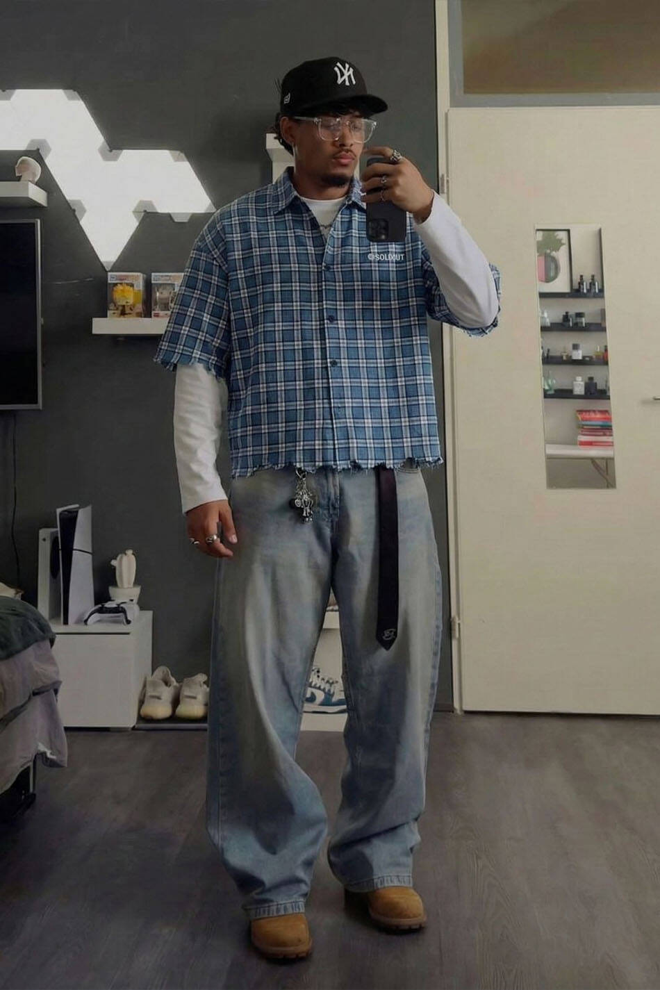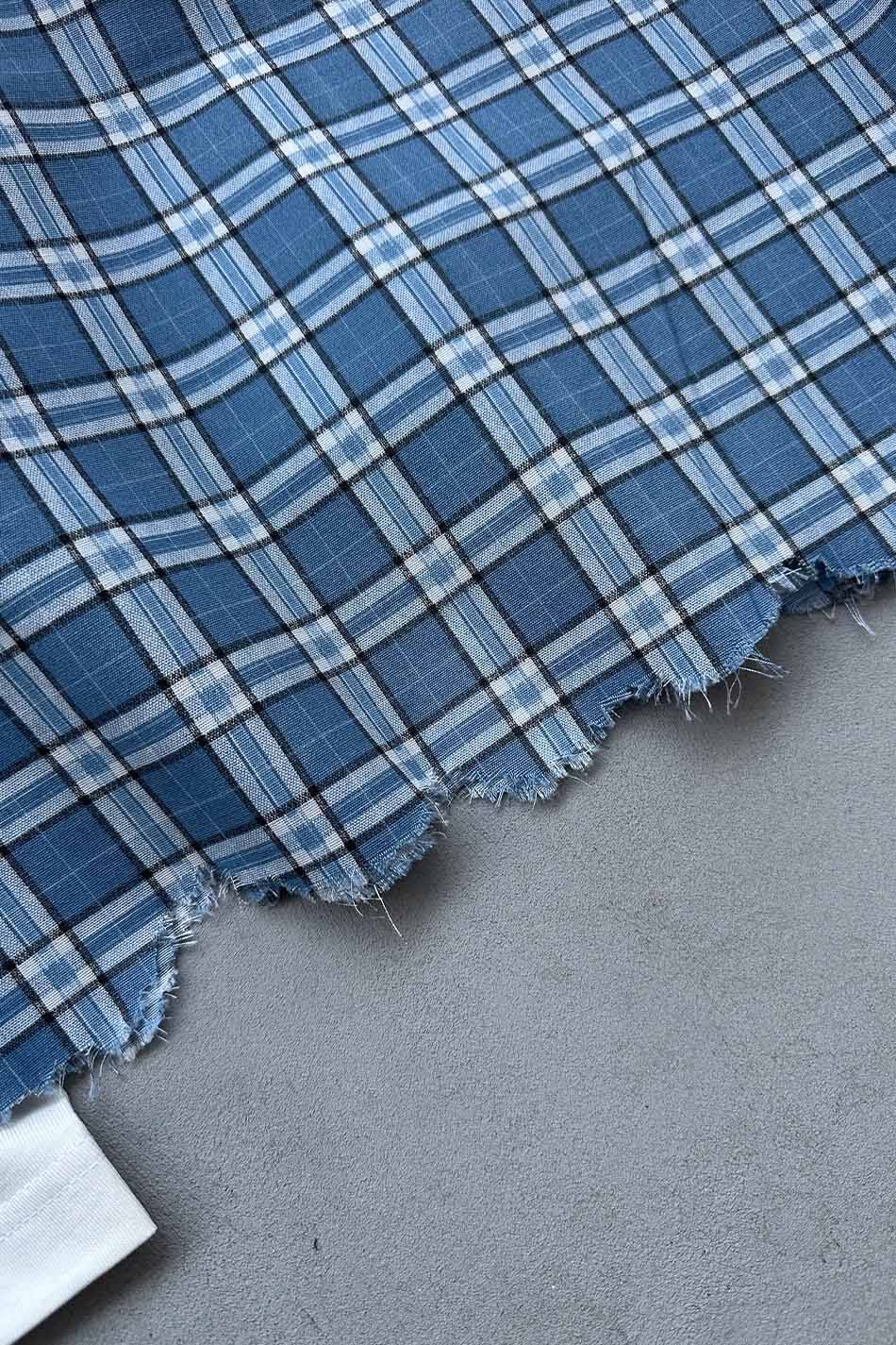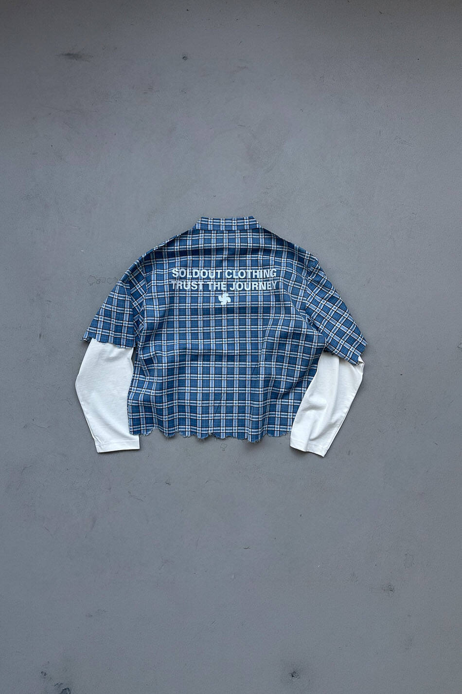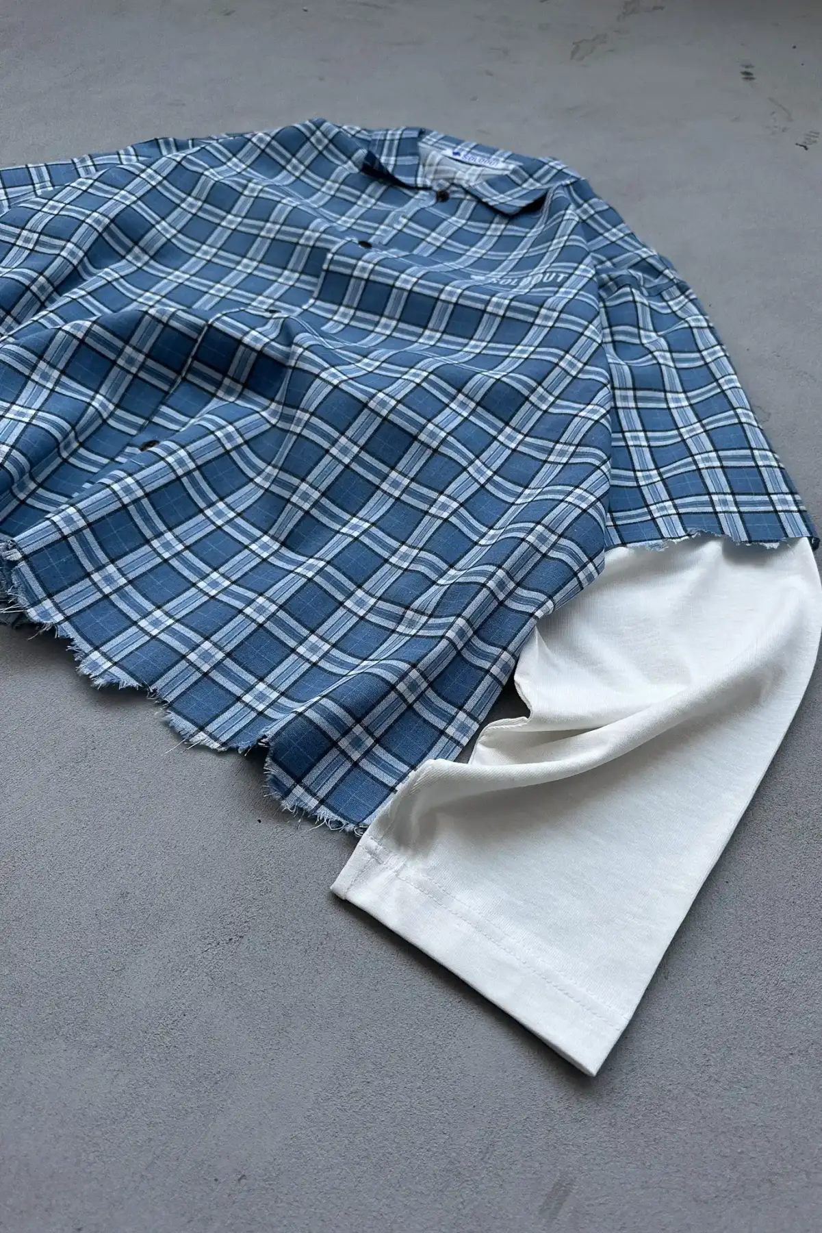 Mavi ekose desenli pamuklu kumaştan üretilmiştir. Kendinden katmanlı (layered) tasarımı sayesinde gövdeye dikili beyaz uzun kollu iç detayına sahiptir. Gömleğin kısa kol uçları ve etek ucu yırtık efektli bir görünüme sahiptir. Ön ve arka kısımlarına DTF yöntemiyle baskı uygulanmıştır. Önden tam düğme kapamalı olan ürün, geniş ve kutu formundaki (boxy fit) kesimiyle konforlu ve dökümlü bir kullanım sunar.