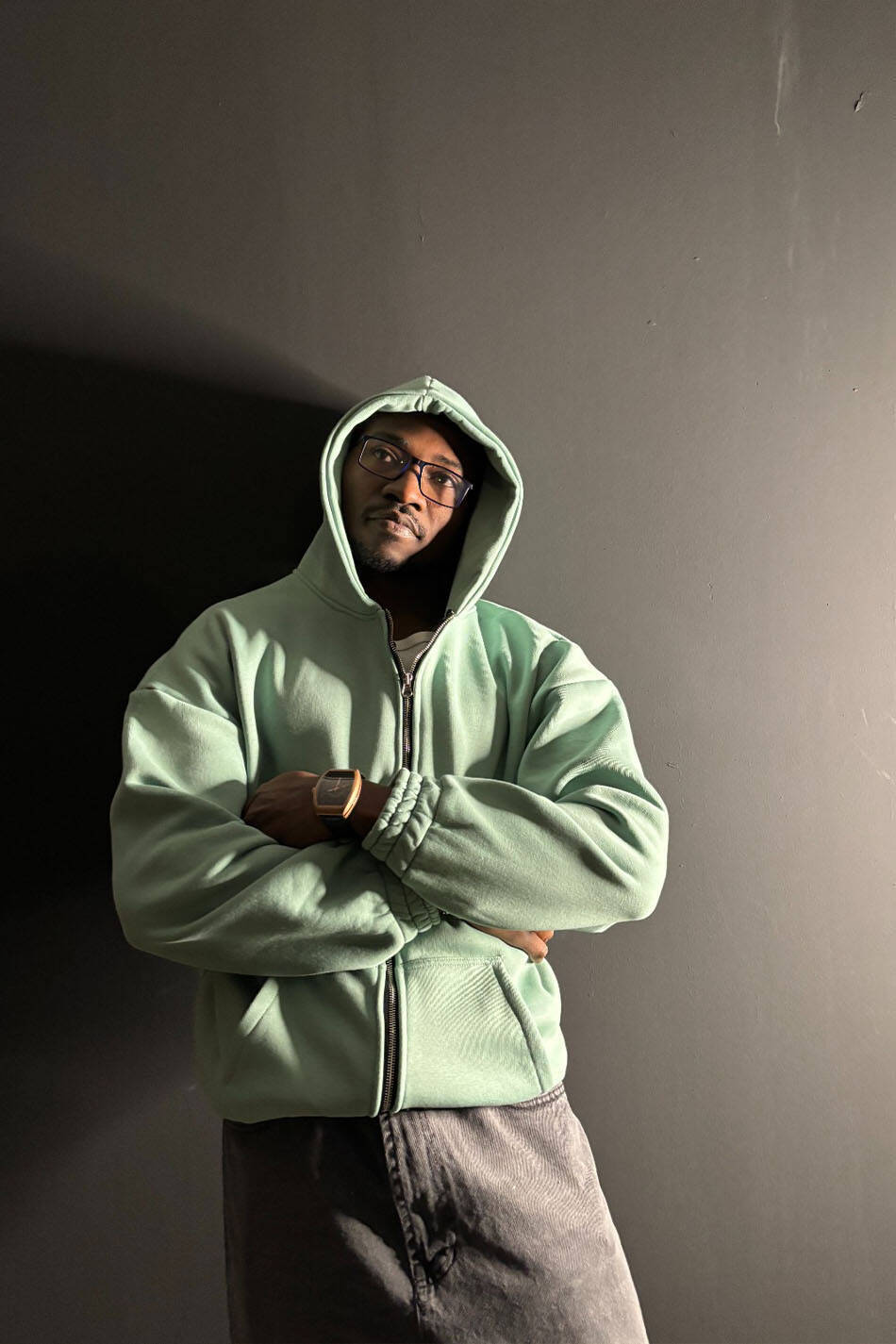 Pamuk karışımlı Oeko Tex sertifikalı kumaştan üretilmiş ve içi yumuşak tüylü orta kalınlıkta boxy fit oversize kapüşonlu sweatshirt. Kapüşonu astarlı, düşük omuzlu, uzun kollu, kanguru cepli, manşetleri ve etek ucu geniş kendi kumaşından lastikli,fermuarı çift taraftan açılabilen üst.